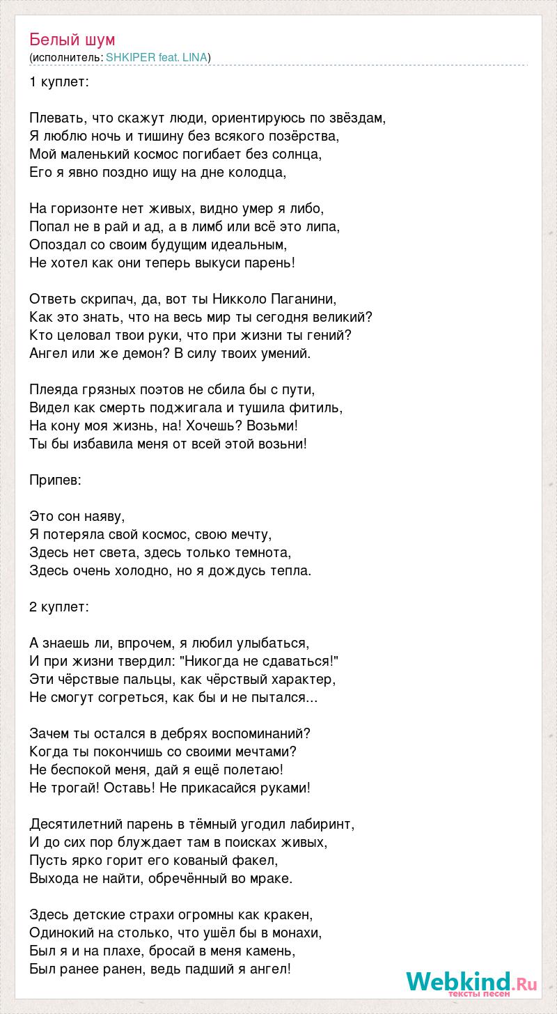 1 куплет: Плевать, что скажут люди, ориентируюсь по звёздам, Я люблю ночь и тишину без всякого позёрства, Мой маленький космос погибает без солнца, Его я явно поздно ищу на дне колодца, На горизонте нет живых, видно умер я либо, Попал не в рай и ад, а в лимб или всё это липа, Опоздал со своим будущим идеальным, Не хотел как они теперь выкуси парень! Ответь скрипач, да, вот ты Никколо Паганини, Как это знать, что на весь мир ты сегодня великий? Кто целовал твои руки, что при жизни ты гений? Ангел или же демон? В силу твоих умений. Плеяда грязных поэтов не сбила бы с пути, Видел как смерть поджигала и тушила фитиль, На кону моя жизнь, на! Хочешь? Возьми! Ты бы избавила меня от всей этой возьни! Припев: Это сон наяву, Я потеряла свой космос, свою мечту, Здесь нет света, здесь только темнота, Здесь очень холодно, но я дождусь тепла. 2 куплет: А знаешь ли, впрочем, я любил улыбаться, И при жизни твердил: "Никогда не сдаваться!" Эти чёрствые пальцы, как чёрствый характер, Не смогут согреться, как бы и не пытался... Зачем ты остался в дебрях воспоминаний? Когда ты покончишь со своими мечтами? Не беспокой меня, дай я ещё полетаю! Не трогай! Оставь! Не прикасайся руками! Десятилетний парень в тёмный угодил лабиринт, И до сих пор блуждает там в поисках живых, Пусть ярко горит его кованый факел, Выхода не найти, обречённый во мраке. Здесь детские страхи огромны как кракен, Одинокий на столько, что ушёл бы в монахи, Был я и на плахе, бросай в меня камень, Был ранее ранен, ведь падший я ангел!
