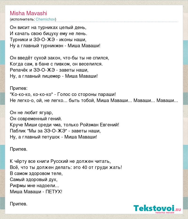 Он висит на турниках целый день, И качать свою бицуху ему не лень. Турники и ЗЭ-О-ЖЭ - иконы наши, Ну а главный турникмэн - Миша Маваши! Он введёт сухой закон, что-бы ты не спился, Когда сам, в бане с пивком, он веселился. Репачёк и ЗЭ-О-ЖЭ - заветы наши, Ну, а главный лицемер - Миша Маваши! Припев: "Ко-ко-ко, ко-ко-ко" - Голос со стороны параши! Не легко-о, ой, не легко... быть тобой, Миша Маваши... Маваши... Маваши... Он не любит ягуар, Он современный гений. Круче Миши среди чма, только Ройзман Евгений! Паблик "Мы за ЗЭ-О-ЖЭ" - заветы наши, Ну, а главный петушок - Миша Маваши! Припев. К чёрту все книги Русский не должен читать, Всё, что ты должен делать: это 40 от груди жать! В самом здоровом теле, Самый здоровый дух, Рифмы мне надоели... Миша Маваши - ПЕТУХ! Припев.