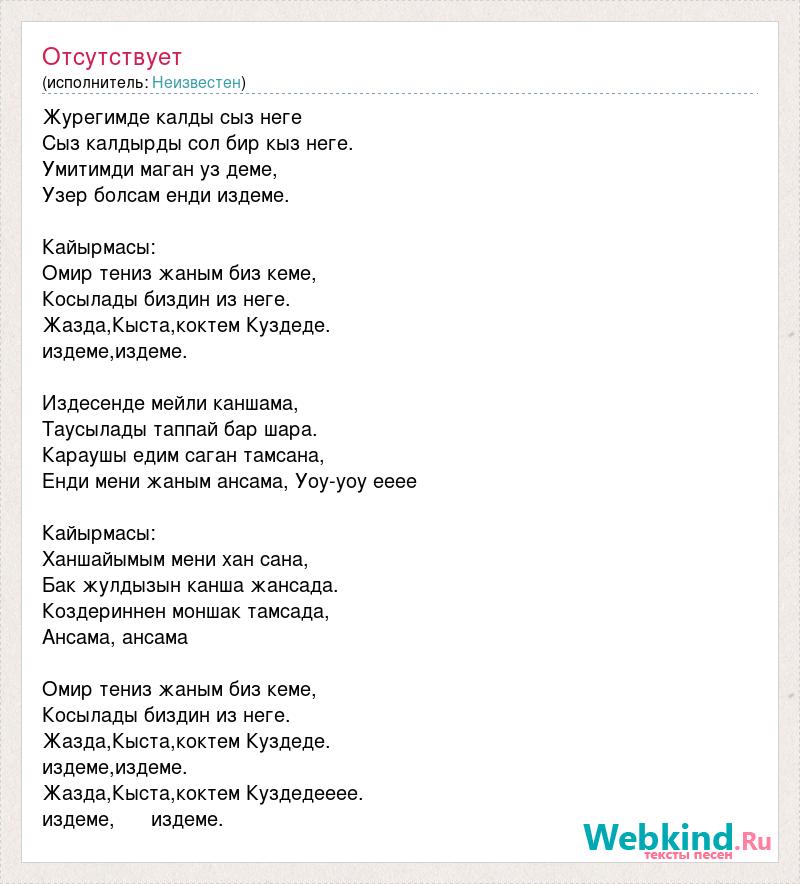 Журегимде калды сыз неге Сыз калдырды сол бир кыз неге. Умитимди маган уз деме, Узер болсам енди издеме. Кайырмасы: Омир тениз жаным биз кеме, Косылады биздин из неге. Жазда,Кыста,коктем Куздеде. издеме,издеме. Издесенде мейли каншама, Таусылады таппай бар шара. Караушы едим саган тамсана, Енди мени жаным ансама, Уоу-уоу ееее Кайырмасы: Ханшайымым мени хан сана, Бак жулдызын канша жансада. Коздериннен моншак тамсада, Ансама, ансама Омир тениз жаным биз кеме, Косылады биздин из неге. Жазда,Кыста,коктем Куздеде. издеме,издеме. Жазда,Кыста,коктем Куздедееее. издеме, издеме.