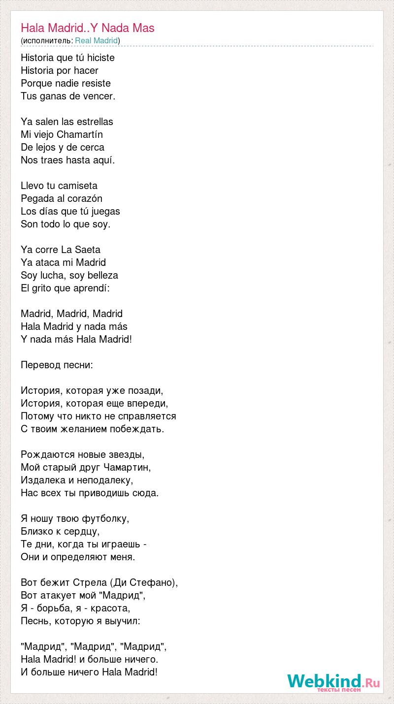 Historia que tú hiciste Historia por hacer Porque nadie resiste Tus ganas de vencer. Ya salen las estrellas Mi viejo Chamartín De lejos y de cerca Nos traes hasta aquí. Llevo tu camiseta Pegada al corazón Los días que tú juegas Son todo lo que soy. Ya corre La Saeta Ya ataca mi Madrid Soy lucha, soy belleza El grito que aprendí: Madrid, Madrid, Madrid Hala Madrid y nada más Y nada más Hala Madrid! Перевод песни: История, которая уже позади, История, которая еще впереди, Потому что никто не справляется С твоим желанием побеждать. Рождаются новые звезды, Мой старый друг Чамартин, Издалека и неподалеку, Нас всех ты приводишь сюда. Я ношу твою футболку, Близко к сердцу, Те дни, когда ты играешь - Они и определяют меня. Вот бежит Стрела (Ди Стефано), Вот атакует мой "Мадрид", Я - борьба, я - красота, Песнь, которую я выучил: "Мадрид", "Мадрид", "Мадрид", Hala Madrid! и больше ничего. И больше ничего Hala Madrid!