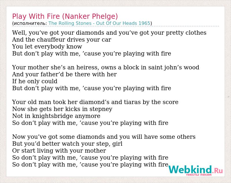 Well, you’ve got your diamonds and you’ve got your pretty clothes And the chauffeur drives your car You let everybody know But don’t play with me, ’cause you’re playing with fire Your mother she’s an heiress, owns a block in saint john’s wood And your father’d be there with her If he only could But don’t play with me, ’cause you’re playing with fire Your old man took her diamond’s and tiaras by the score Now she gets her kicks in stepney Not in knightsbridge anymore So don’t play with me, ’cause you’re playing with fire Now you’ve got some diamonds and you will have some others But you’d better watch your step, girl Or start living with your mother So don’t play with me, ’cause you’re playing with fire So don’t play with me, ’cause you’re playing with fire