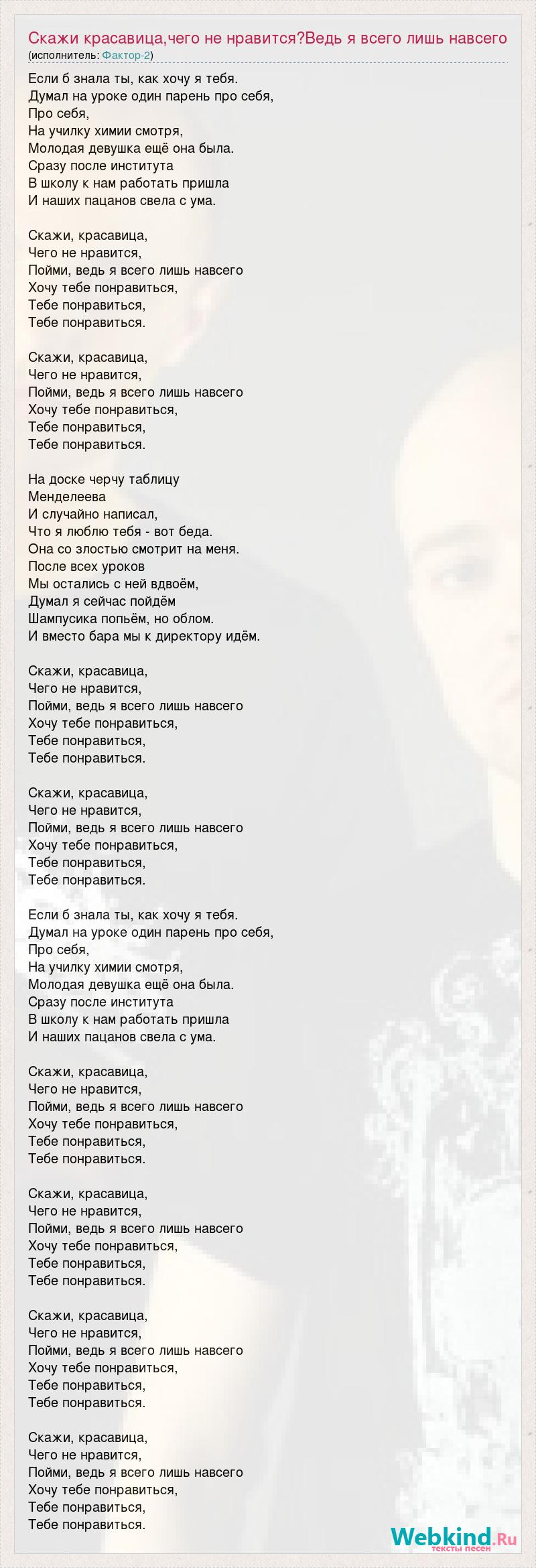 Если б знала ты, как хочу я тебя. Думал на уроке один парень про себя, Про себя, На училку химии смотря, Молодая девушка ещё она была. Сразу после института В школу к нам работать пришла И наших пацанов свела с ума. Скажи, красавица, Чего не нравится, Пойми, ведь я всего лишь навсего Хочу тебе понравиться, Тебе понравиться, Тебе понравиться. Скажи, красавица, Чего не нравится, Пойми, ведь я всего лишь навсего Хочу тебе понравиться, Тебе понравиться, Тебе понравиться. На доске черчу таблицу Менделеева И случайно написал, Что я люблю тебя - вот беда. Она со злостью смотрит на меня. После всех уроков Мы остались с ней вдвоём, Думал я сейчас пойдём Шампусика попьём, но облом. И вместо бара мы к директору идём. Скажи, красавица, Чего не нравится, Пойми, ведь я всего лишь навсего Хочу тебе понравиться, Тебе понравиться, Тебе понравиться. Скажи, красавица, Чего не нравится, Пойми, ведь я всего лишь навсего Хочу тебе понравиться, Тебе понравиться, Тебе понравиться. Если б знала ты, как хочу я тебя. Думал на уроке один парень про себя, Про себя, На училку химии смотря, Молодая девушка ещё она была. Сразу после института В школу к нам работать пришла И наших пацанов свела с ума. Скажи, красавица, Чего не нравится, Пойми, ведь я всего лишь навсего Хочу тебе понравиться, Тебе понравиться, Тебе понравиться. Скажи, красавица, Чего не нравится, Пойми, ведь я всего лишь навсего Хочу тебе понравиться, Тебе понравиться, Тебе понравиться. Скажи, красавица, Чего не нравится, Пойми, ведь я всего лишь навсего Хочу тебе понравиться, Тебе понравиться, Тебе понравиться. Скажи, красавица, Чего не нравится, Пойми, ведь я всего лишь навсего Хочу тебе понравиться, Тебе понравиться, Тебе понравиться.