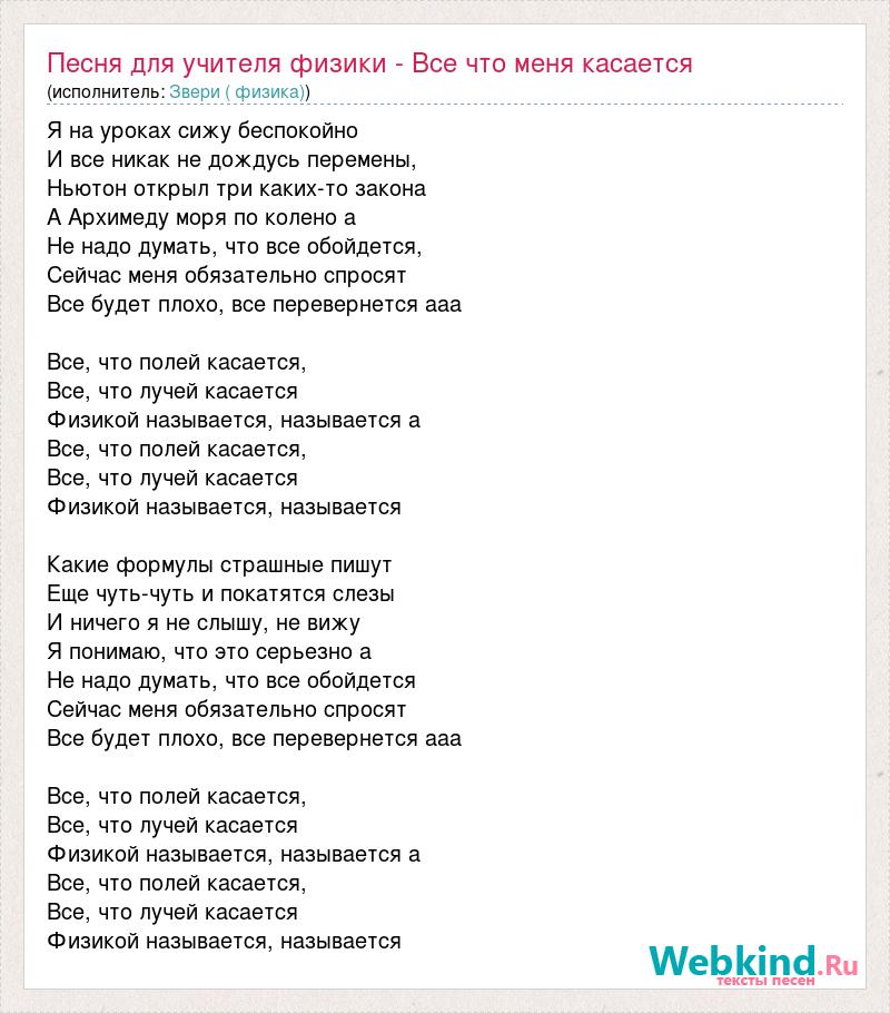 Я на уроках сижу беспокойно И все никак не дождусь перемены, Ньютон открыл три каких-то закона А Архимеду моря по колено а Не надо думать, что все обойдется, Сейчас меня обязательно спросят Все будет плохо, все перевернется ааа Все, что полей касается, Все, что лучей касается Физикой называется, называется а Все, что полей касается, Все, что лучей касается Физикой называется, называется Какие формулы страшные пишут Еще чуть-чуть и покатятся слезы И ничего я не слышу, не вижу Я понимаю, что это серьезно а Не надо думать, что все обойдется Сейчас меня обязательно спросят Все будет плохо, все перевернется ааа Все, что полей касается, Все, что лучей касается Физикой называется, называется а Все, что полей касается, Все, что лучей касается Физикой называется, называется