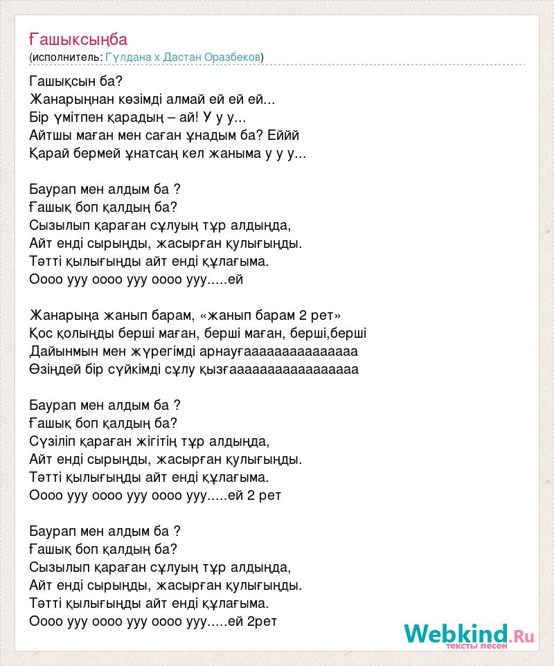 Гашықсын ба? Жанарыңнан көзімді алмай ей ей ей... Бір үмітпен қарадың – ай! У у у... Айтшы маған мен саған ұнадым ба? Еййй Қарай бермей ұнатсаң кел жаныма у у у... Баурап мен алдым ба ? Ғашық боп қалдың ба? Сызылып қараған сұлуың тұр алдыңда, Айт енді сырыңды, жасырған қулығыңды. Тәтті қылығыңды айт енді құлағыма. Оооо ууу оооо ууу оооо ууу.....ей Жанарыңа жанып барам, «жанып барам 2 рет» Қос қолыңды берші маған, берші маған, берші,берші Дайынмын мен жүрегімді арнауғааааааааааааааа Өзіңдей бір сүйкімді сұлу қызғааааааааааааааааа Баурап мен алдым ба ? Ғашық боп қалдың ба? Сүзіліп қараған жігітің тұр алдыңда, Айт енді сырыңды, жасырған қулығыңды. Тәтті қылығыңды айт енді құлағыма. Оооо ууу оооо ууу оооо ууу.....ей 2 рет Баурап мен алдым ба ? Ғашық боп қалдың ба? Сызылып қараған сұлуың тұр алдыңда, Айт енді сырыңды, жасырған қулығыңды. Тәтті қылығыңды айт енді құлағыма. Оооо ууу оооо ууу оооо ууу.....ей 2рет