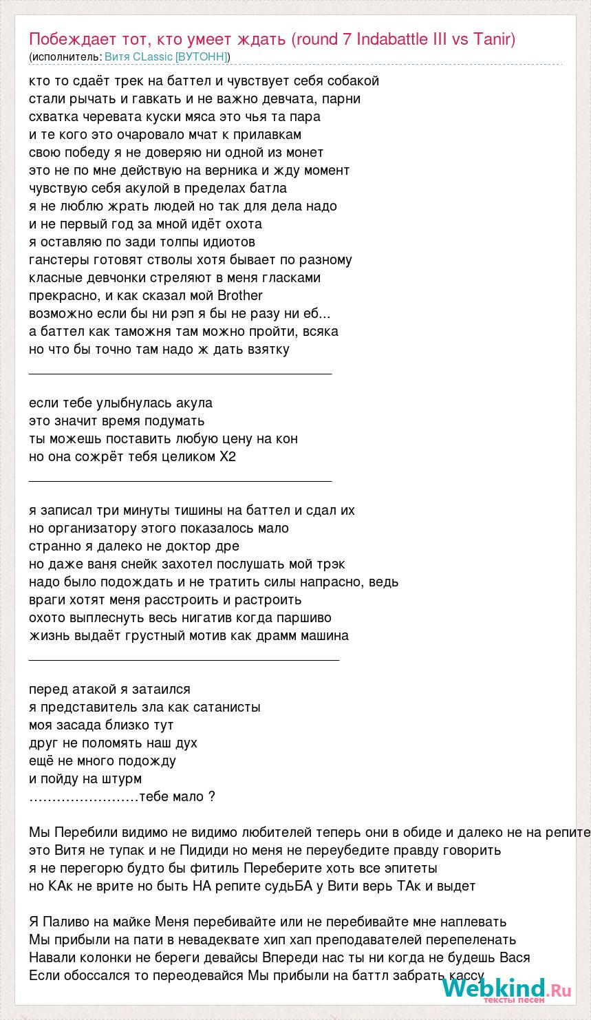 Главная→Исполнители→Витя CLassic [ВУТОНН]→Побеждает тот, кто умеет ждать (round 7 Indabattle III vs Tanir)