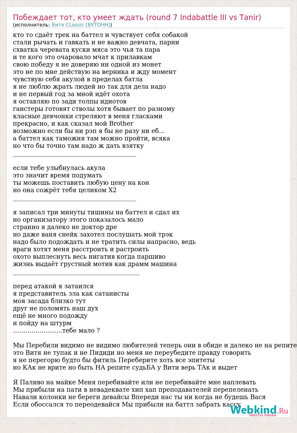 Главная→Исполнители→Витя CLassic [ВУТОНН]→Побеждает тот, кто умеет ждать (round 7 Indabattle III vs Tanir)