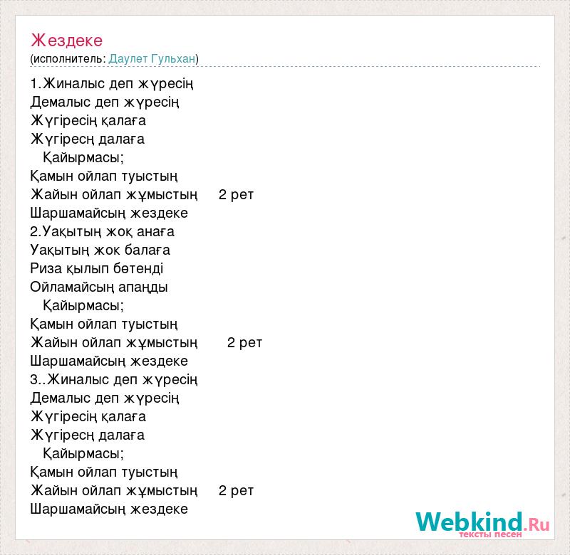 1.Жиналыс деп жүресің Демалыс деп жүресің Жүгіресің қалаға Жүгіресң далаға Қайырмасы; Қамын ойлап туыстың Жайын ойлап жұмыстың 2 рет Шаршамайсың жездеке 2.Уақытың жоқ анаға Уақытың жок балаға Риза қылып бөтенді Ойламайсың апаңды Қайырмасы; Қамын ойлап туыстың Жайын ойлап жұмыстың 2 рет Шаршамайсың жездеке 3..Жиналыс деп жүресің Демалыс деп жүресің Жүгіресің қалаға Жүгіресң далаға Қайырмасы; Қамын ойлап туыстың Жайын ойлап жұмыстың 2 рет Шаршамайсың жездеке