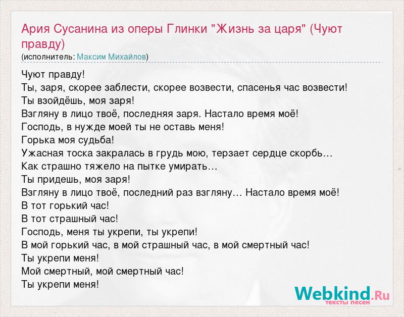 Чуют правду! Ты, заря, скорее заблести, скорее возвести, спасенья час возвести! Ты взойдёшь, моя заря! Взгляну в лицо твоё, последняя заря. Настало время моё! Господь, в нужде моей ты не оставь меня! Горька моя судьба! Ужасная тоска закралась в грудь мою, терзает сердце скорбь… Как страшно тяжело на пытке умирать… Ты придешь, моя заря! Взгляну в лицо твоё, последний раз взгляну… Настало время моё! В тот горький час! В тот страшный час! Господь, меня ты укрепи, ты укрепи! В мой горький час, в мой страшный час, в мой смертный час! Ты укрепи меня! Мой смертный, мой смертный час! Ты укрепи меня!
