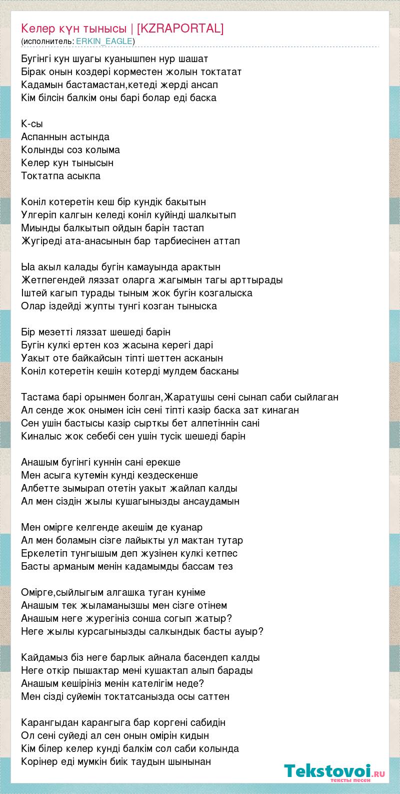 Бугінгі кун шуагы куанышпен нур шашат Бірак онын коздері корместен жолын токтатат Кадамын бастамастан,кетеді жерді ансап Кім білсін балкім оны барі болар еді баска К-сы Аспаннын астында Колынды соз колыма Келер кун тынысын Токтатпа асыкпа Коніл котеретін кеш бір кундік бакытын Улгеріп калгын келеді коніл куйінді шалкытып Миынды балкытып ойдын барін тастап Жугіреді ата-анасынын бар тарбиесінен аттап Ыа акыл калады бугін камауында арактын Жетпегендей ляззат оларга жагымын тагы арттырады Іштей кагып турады тыным жок бугін козгалыска Олар іздейді жупты тунгі козган тыныска Бір мезетті ляззат шешеді барін Бугін кулкі ертен коз жасына керегі дарі Уакыт оте байкайсын тіпті шеттен асканын Коніл котеретін кешін котерді мулдем басканы Тастама барі орынмен болган,Жаратушы сені сынап саби сыйлаган Ал сенде жок онымен ісін сені тіпті казір баска зат кинаган Сен ушін бастысы казір сырткы бет алпетіннін сані Киналыс жок себебі сен ушін тусік шешеді барін Анашым бугінгі куннін сані ерекше Мен асыга кутемін кунді кездескенше Албетте зымырап отетін уакыт жайлап калды Ал мен сіздін жылы кушагынызды ансаудамын Мен омірге келгенде акешім де куанар Ал мен боламын сізге лайыкты ул мактан тутар Еркелетіп тунгышым деп жузінен кулкі кетпес Басты арманым менін кадамымды бассам тез Омірге,сыйлыгым алгашка туган куніме Анашым тек жыламанызшы мен сізге отінем Анашым неге журегініз сонша согып жатыр? Неге жылы курсагынызды салкындык басты ауыр? Кайдамыз біз неге барлык айнала басендеп калды Неге откір пышактар мені кушактап алып барады Анашым кешірініз менін кателігім неде? Мен сізді суйемін токтатсанызда осы саттен Карангыдан карангыга бар коргені сабидін Ол сені суйеді ал сен онын омірін кидын Кім білер келер кунді балкім сол саби колында Корінер еді мумкін биік таудын шынынан