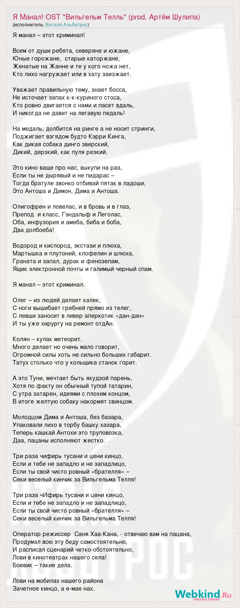 Я манал – этот криминал! Всем от души ребята, северяне и южане, Юные горожане, старые каторжане, Женатые на Жанне и те у кого ножа нет, Кто лихо нагружает или в хату заезжает. Уважает правильную тему, знает босса, Не источает запах к-к-куриного стоса, Кто ровно двигается с нами и пасет вдаль, И никогда не давит на легавую педаль! На медаль, долбится на ринге а не носит стринги, Поджигает взгядом будто Кэрри Кинга, Как дикая собака динго зверский, Дикий, дерзкий, как пуля резкий. Это кино ваще про нас, выкупи на раз, Если ты не дырявый и не пидарас – Тогда братуле звонко отбивай пятак в ладоши, Это Антоша и Димон, Дима и Антоша. Олигофрен и ловелас, и в бровь и в глаз, Препод и класс, Гэндальф и Леголас, Оба, инфузория и амеба, биба и боба, Два долбоеба! Водород и кислород, экстази и плюха, Мартышка и плутоний, клофелин и шлюха, Граната и запал, дурак и фенозепам, Ящик электронной почты и галимый черный спам. Я манал – этот криминал. Олег – из людей делает калек, С ноги вышибает гребней прямо из телег, С левши заносит в ливер аперкотик «дан-дан» И ты уже хирургу на ремонт отдАн. Колян – кулак метеорит. Много делает но очень мало говорит, Огромной силы хоть не сильно больших габарит. Татух столько что у кольщика станок горит. А это Туни, мечтает быть якудзой парень, Хотя по факту он обычный тупой татарин, С утра затарен, идеями с плохим концом, В итоге желтую собаку накормят свинцом. Молодцом Дима и Антоша, без базара, Упаковали лихо в торбу башку хазара, Теперь кашкай Антохи это труповозка, Даа, пацаны исполняют жестко. Три раза чифирь тусани и цени кинцо, Если и тебе не западло и не западлицо, Если ты свой чисто ровный «брателля» – Секи веселый кинчик за Вильгельма Телля! Три раза чИфирь тусани и цени кинцо, Если и тебе не западло и не западлицо, Если ты свой чисто ровный «брателля» – Секи веселый кинчик за Вильгельма Телля! Оператор режиссер Саня Хаа-Кана, - отвечаю вам на пацана, Продумал всю эту беду самостоятельно, И расписал сценарий четко-обстоятельно, Лови в кинотеатрах нашего села! Боевик – такие дела. Лови на мобилах нашего района Зачетное кинцо, а е-мае нах.