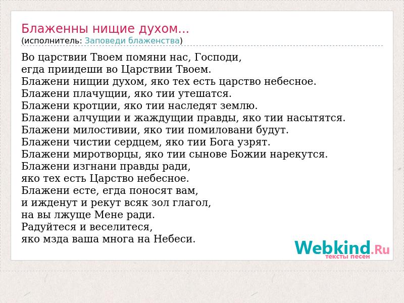 Во царствии Твоем помяни нас, Господи, егда приидеши во Царствии Твоем. Блажени нищии духом, яко тех есть царство небесное. Блажени плачущии, яко тии утешатся. Блажени кротции, яко тии наследят землю. Блажени алчущии и жаждущии правды, яко тии насытятся. Блажени милостивии, яко тии помиловани будут. Блажени чистии сердцем, яко тии Бога узрят. Блажени миротворцы, яко тии сынове Божии нарекутся. Блажени изгнани правды ради, яко тех есть Царство небесное. Блажени есте, егда поносят вам, и ижденут и рекут всяк зол глагол, на вы лжуще Мене ради. Радуйтеся и веселитеся, яко мзда ваша многа на Небеси.