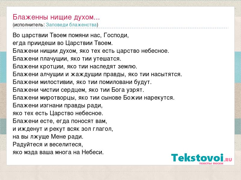 Во царствии Твоем помяни нас, Господи, егда приидеши во Царствии Твоем. Блажени нищии духом, яко тех есть царство небесное. Блажени плачущии, яко тии утешатся. Блажени кротции, яко тии наследят землю. Блажени алчущии и жаждущии правды, яко тии насытятся. Блажени милостивии, яко тии помиловани будут. Блажени чистии сердцем, яко тии Бога узрят. Блажени миротворцы, яко тии сынове Божии нарекутся. Блажени изгнани правды ради, яко тех есть Царство небесное. Блажени есте, егда поносят вам, и ижденут и рекут всяк зол глагол, на вы лжуще Мене ради. Радуйтеся и веселитеся, яко мзда ваша многа на Небеси.