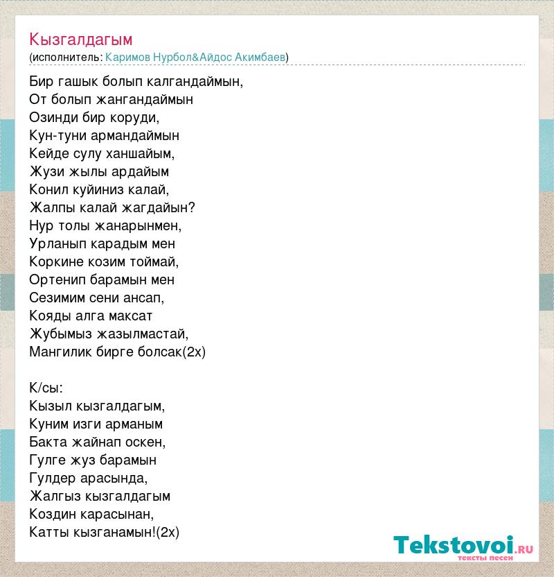 Бир гашык болып калгандаймын, От болып жангандаймын Озинди бир коруди, Кун-туни армандаймын Кейде сулу ханшайым, Жузи жылы ардайым Конил куйиниз калай, Жалпы калай жагдайын? Нур толы жанарынмен, Урланып карадым мен Коркине козим тоймай, Ортенип барамын мен Сезимим сени ансап, Кояды алга максат Жубымыз жазылмастай, Мангилик бирге болсак(2х) К/сы: Кызыл кызгалдагым, Куним изги арманым Бакта жайнап оскен, Гулге жуз барамын Гулдер арасында, Жалгыз кызгалдагым Коздин карасынан, Катты кызганамын!(2х)