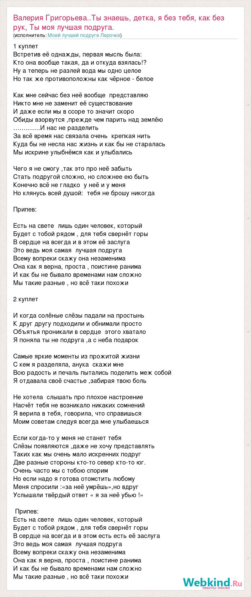 1 куплет Встретив её однажды, первая мысль была: Кто она вообще такая, да и откуда взялась!? Ну а теперь не разлей вода мы одно целое Но так же противоположны как чёрное - белое Как мне сейчас без неё вообще представляю Никто мне не заменит её существование И даже если мы в ссоре то значит скоро Обиды взорвутся ,прежде чем парить над землёю ………….И нас не разделить За всё время нас связала очень крепкая нить Куда бы не несла нас жизнь и как бы не старалась Мы искрине улыбнёмся как и улыбались Чего я не смогу ,так это про неё забыть Стать подругой сложно, но сложнее ею быть Конечно всё не гладко у неё и у меня Но клянусь всей душой: тебя не брошу никогда Припев: Есть на свете лишь один человек, который Будет с тобой рядом , для тебя свернёт горы В сердце на всегда и в этом её заслуга Это ведь моя самая лучшая подруга Всему вопреки скажу она незаменима Она как я верна, проста , поистине ранима И как бы не бывало временами нам сложно Мы такие разные , но всё таки похожи 2 куплет И когда солёные слёзы падали на простынь К друг другу подходили и обнимали просто Объятья проникали в сердце этого хватало Я поняла ты не подруга ,а с неба подарок Самые яркие моменты из прожитой жизни С кем я разделяла, анука скажи мне Всю радость и печаль пытались поделить меж собой Я отдавала своё счастье ,забирая твою боль Не хотела слышать про плохое настроение Насчёт тебя не возникало никаких сомнений Я верила в тебя, говорила, что справишься Моим советам следуя всегда мне улыбаешься Если когда-то у меня не станет тебя Слёзы появляются ,даже не хочу представлять Таких как мы очень мало искренних подруг Две разные стороны кто-то север кто-то юг. Очень часто мы с тобою спорим Но если надо я готова отомстить любому Меня спросили :«за неё умрёшь»,но вдруг Услышали твёрдый ответ « я за неё убью !» Припев: Есть на свете лишь один человек, который Будет с тобой рядом , для тебя свернёт горы В сердце на всегда и в этом есть есть её заслуга Это ведь моя самая лучшая подруга Всему вопреки скажу она незаменима Она как я верна, проста , поистине ранима И как бы не бывало временами нам сложно Мы такие разные , но всё таки похожи