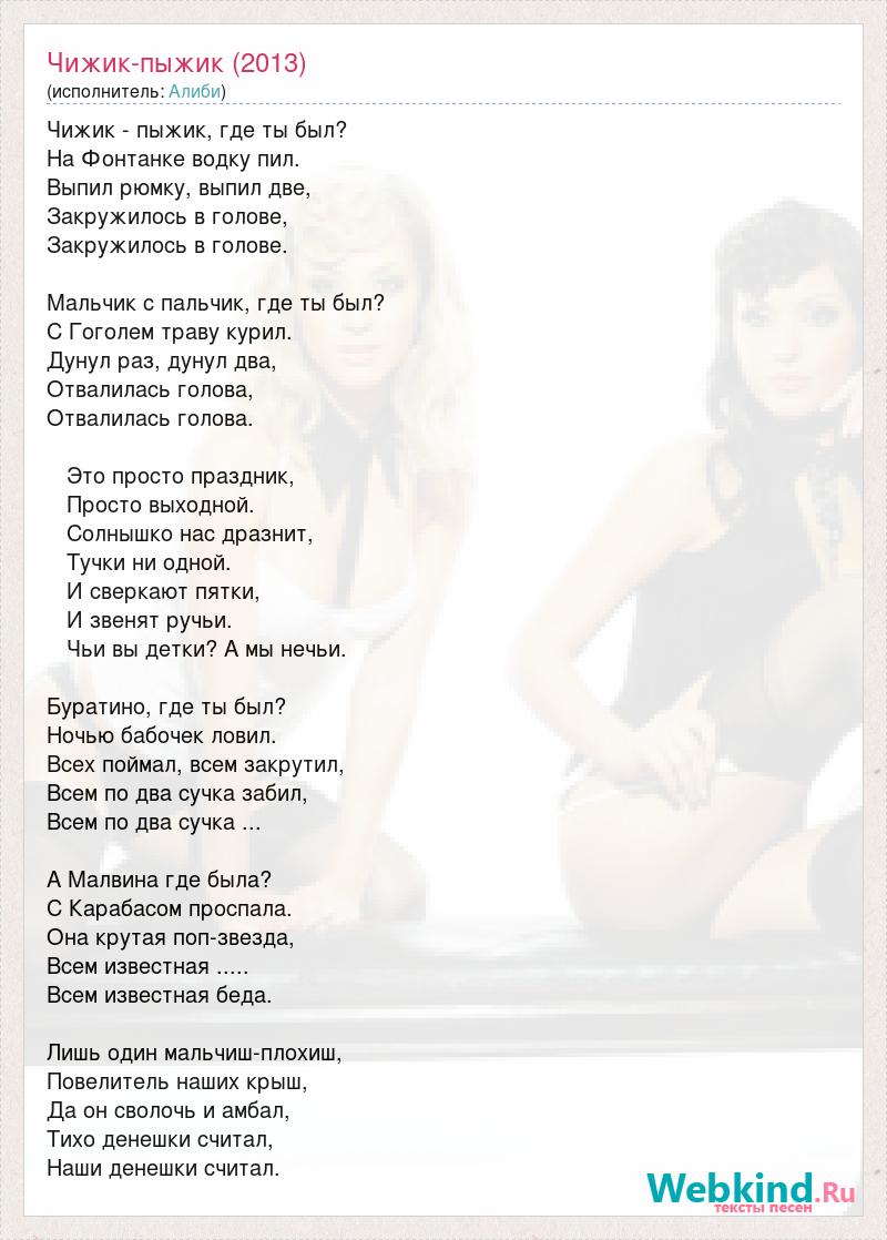 Чижик - пыжик, где ты был? На Фонтанке водку пил. Выпил рюмку, выпил две, Закружилось в голове, Закружилось в голове. Мальчик с пальчик, где ты был? С Гоголем траву курил. Дунул раз, дунул два, Отвалилась голова, Отвалилась голова. Это просто праздник, Просто выходной. Солнышко нас дразнит, Тучки ни одной. И сверкают пятки, И звенят ручьи. Чьи вы детки? А мы нечьи. Буратино, где ты был? Ночью бабочек ловил. Всех поймал, всем закрутил, Всем по два сучка забил, Всем по два сучка ... А Малвина где была? С Карабасом проспала. Она крутая поп-звезда, Всем известная ..... Всем известная беда. Лишь один мальчиш-плохиш, Повелитель наших крыш, Да он сволочь и амбал, Тихо денешки считал, Наши денешки считал.