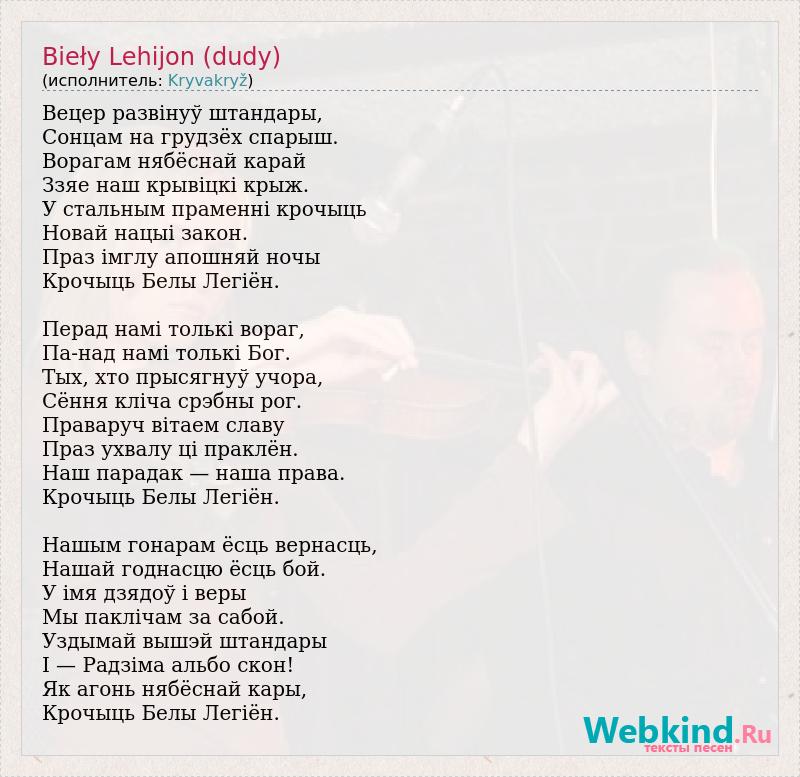 Вецер развінуў штандары, Сонцам на грудзёх спарыш. Ворагам нябёснай карай Ззяе наш крывіцкі крыж. У стальным праменні крочыць Новай нацыі закон. Праз імглу апошняй ночы Крочыць Белы Легіён. Перад намі толькі вораг, Па-над намі толькі Бог. Тых, хто прысягнуў учора, Сёння кліча срэбны рог. Праваруч вітаем славу Праз ухвалу ці праклён. Наш парадак — наша права. Крочыць Белы Легіён. Нашым гонарам ёсць вернасць, Нашай годнасцю ёсць бой. У імя дзядоў і веры Мы паклічам за сабой. Уздымай вышэй штандары І — Радзіма альбо скон! Як агонь нябёснай кары, Крочыць Белы Легіён.