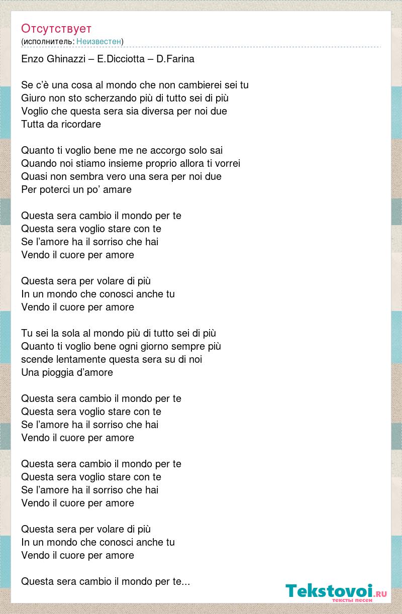 Enzo Ghinazzi – E.Dicciotta – D.Farina Se c’è una cosa al mondo che non cambierei sei tu Giuro non sto scherzando più di tutto sei di più Voglio che questa sera sia diversa per noi due Tutta da ricordare Quanto ti voglio bene me ne accorgo solo sai Quando noi stiamo insieme proprio allora ti vorrei Quasi non sembra vero una sera per noi due Per poterci un po’ amare Questa sera cambio il mondo per te Questa sera voglio stare con te Se l’amore ha il sorriso che hai Vendo il cuore per amore Questa sera per volare di più In un mondo che conosci anche tu Vendo il cuore per amore Tu sei la sola al mondo più di tutto sei di più Quanto ti voglio bene ogni giorno sempre più scende lentamente questa sera su di noi Una pioggia d’amore Questa sera cambio il mondo per te Questa sera voglio stare con te Se l’amore ha il sorriso che hai Vendo il cuore per amore Questa sera cambio il mondo per te Questa sera voglio stare con te Se l’amore ha il sorriso che hai Vendo il cuore per amore Questa sera per volare di più In un mondo che conosci anche tu Vendo il cuore per amore Questa sera cambio il mondo per te...