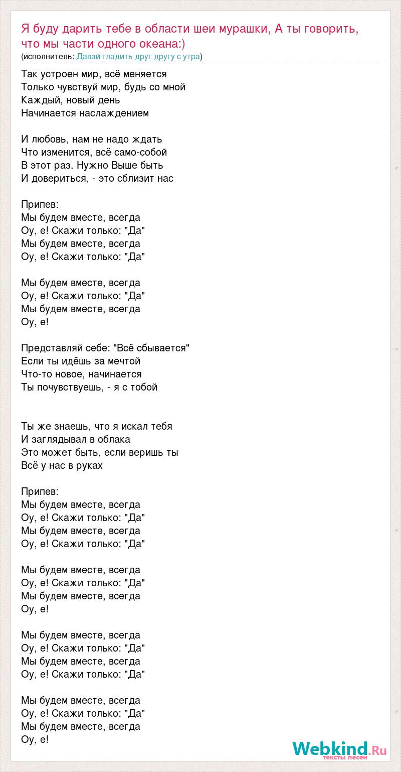 Так устроен мир, всё меняется Только чувствуй мир, будь со мной Каждый, новый день Начинается наслаждением И любовь, нам не надо ждать Что изменится, всё само-собой В этот раз. Нужно Выше быть И довериться, - это сблизит нас Припев: Мы будем вместе, всегда Оу, е! Скажи только: "Да" Мы будем вместе, всегда Оу, е! Скажи только: "Да" Мы будем вместе, всегда Оу, е! Скажи только: "Да" Мы будем вместе, всегда Оу, е! Представляй себе: "Всё сбывается" Если ты идёшь за мечтой Что-то новое, начинается Ты почувствуешь, - я с тобой Ты же знаешь, что я искал тебя И заглядывал в облака Это может быть, если веришь ты Всё у нас в руках Припев: Мы будем вместе, всегда Оу, е! Скажи только: "Да" Мы будем вместе, всегда Оу, е! Скажи только: "Да" Мы будем вместе, всегда Оу, е! Скажи только: "Да" Мы будем вместе, всегда Оу, е! Мы будем вместе, всегда Оу, е! Скажи только: "Да" Мы будем вместе, всегда Оу, е! Скажи только: "Да" Мы будем вместе, всегда Оу, е! Скажи только: "Да" Мы будем вместе, всегда Оу, е!