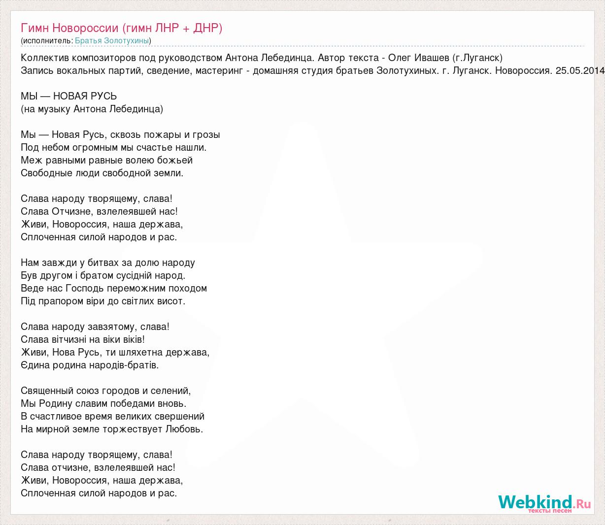 Коллектив композиторов под руководством Антона Лебединца. Автор текста - Олег Ивашев (г.Луганск) Запись вокальных партий, сведение, мастеринг - домашняя студия братьев Золотухиных. г. Луганск. Новороссия. 25.05.2014 МЫ — НОВАЯ РУСЬ (на музыку Антона Лебединца) Мы — Новая Русь, сквозь пожары и грозы Под небом огромным мы счастье нашли. Меж равными равные волею божьей Свободные люди свободной земли. Слава народу творящему, слава! Слава Отчизне, взлелеявшей нас! Живи, Новороссия, наша держава, Сплоченная силой народов и рас. Нам завжди у битвах за долю народу Був другом і братом сусідній народ. Веде нас Господь переможним походом Під прапором віри до світлих висот. Слава народу завзятому, слава! Слава вітчизні на віки віків! Живи, Нова Русь, ти шляхетна держава, Єдина родина народів-братів. Священный союз городов и селений, Мы Родину славим победами вновь. В счастливое время великих свершений На мирной земле торжествует Любовь. Слава народу творящему, слава! Слава отчизне, взлелеявшей нас! Живи, Новороссия, наша держава, Сплоченная силой народов и рас.