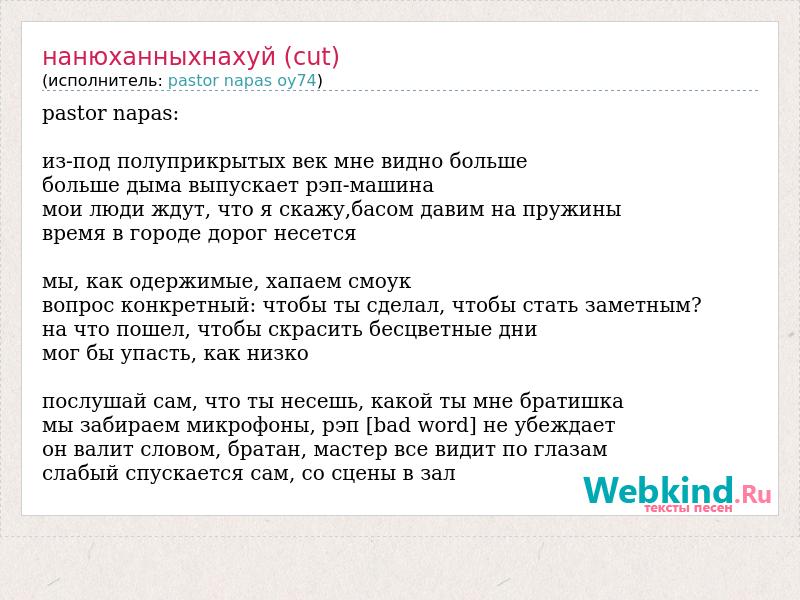 pastor napas: из-под полуприкрытых век мне видно больше больше дыма выпускает рэп-машина мои люди ждут, что я скажу,басом давим на пружины время в городе дорог несется мы, как одержимые, хапаем смоук вопрос конкретный: чтобы ты сделал, чтобы стать заметным? на что пошел, чтобы скрасить бесцветные дни мог бы упасть, как низко послушай сам, что ты несешь, какой ты мне братишка мы забираем микрофоны, рэп [bad word] не убеждает он валит словом, братан, мастер все видит по глазам слабый спускается сам, со сцены в зал