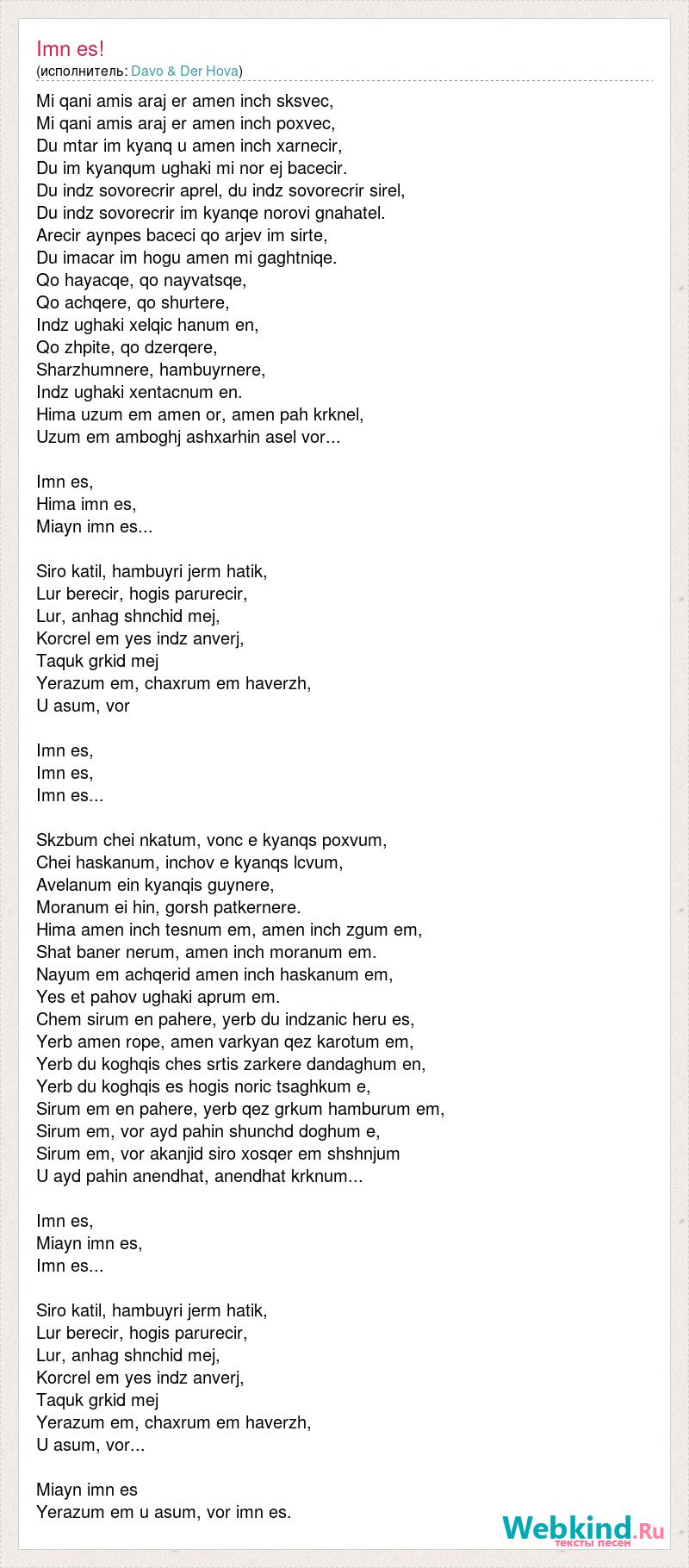 Mi qani amis araj er amen inch sksvec, Mi qani amis araj er amen inch poxvec, Du mtar im kyanq u amen inch xarnecir, Du im kyanqum ughaki mi nor ej bacecir. Du indz sovorecrir aprel, du indz sovorecrir sirel, Du indz sovorecrir im kyanqe norovi gnahatel. Arecir aynpes baceci qo arjev im sirte, Du imacar im hogu amen mi gaghtniqe. Qo hayacqe, qo nayvatsqe, Qo achqere, qo shurtere, Indz ughaki xelqic hanum en, Qo zhpite, qo dzerqere, Sharzhumnere, hambuyrnere, Indz ughaki xentacnum en. Hima uzum em amen or, amen pah krknel, Uzum em amboghj ashxarhin asel vor... Imn es, Hima imn es, Miayn imn es... Siro katil, hambuyri jerm hatik, Lur berecir, hogis parurecir, Lur, anhag shnchid mej, Korcrel em yes indz anverj, Taquk grkid mej Yerazum em, chaxrum em haverzh, U asum, vor Imn es, Imn es, Imn es... Skzbum chei nkatum, vonc e kyanqs poxvum, Chei haskanum, inchov e kyanqs lcvum, Avelanum ein kyanqis guynere, Moranum ei hin, gorsh patkernere. Hima amen inch tesnum em, amen inch zgum em, Shat baner nerum, amen inch moranum em. Nayum em achqerid amen inch haskanum em, Yes et pahov ughaki aprum em. Chem sirum en pahere, yerb du indzanic heru es, Yerb amen rope, amen varkyan qez karotum em, Yerb du koghqis ches srtis zarkere dandaghum en, Yerb du koghqis es hogis noric tsaghkum e, Sirum em en pahere, yerb qez grkum hamburum em, Sirum em, vor ayd pahin shunchd doghum e, Sirum em, vor akanjid siro xosqer em shshnjum U ayd pahin anendhat, anendhat krknum... Imn es, Miayn imn es, Imn es... Siro katil, hambuyri jerm hatik, Lur berecir, hogis parurecir, Lur, anhag shnchid mej, Korcrel em yes indz anverj, Taquk grkid mej Yerazum em, chaxrum em haverzh, U asum, vor... Miayn imn es Yerazum em u asum, vor imn es.