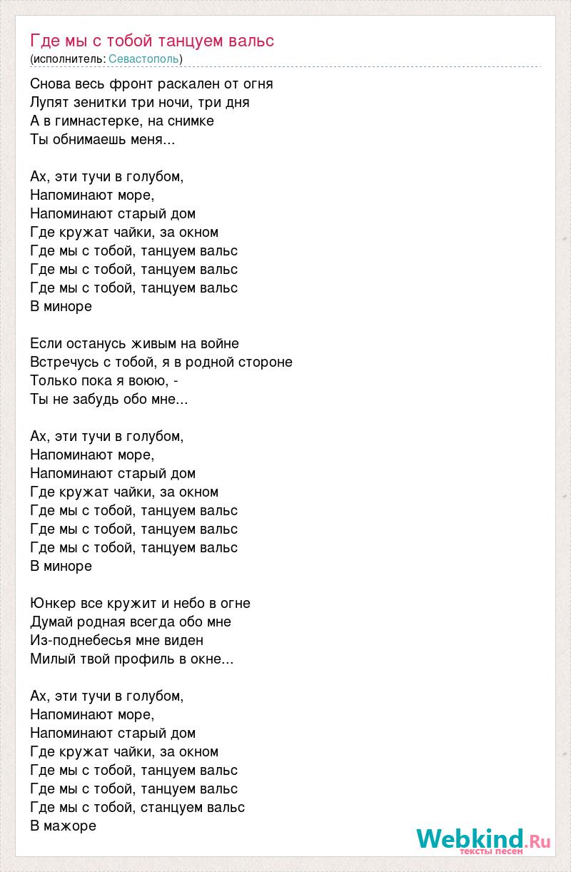 Снова весь фронт раскален от огня Лупят зенитки три ночи, три дня А в гимнастерке, на снимке Ты обнимаешь меня... Ах, эти тучи в голубом, Напоминают море, Напоминают старый дом Где кружат чайки, за окном Где мы с тобой, танцуем вальс Где мы с тобой, танцуем вальс Где мы с тобой, танцуем вальс В миноре Если останусь живым на войне Встречусь с тобой, я в родной стороне Только пока я воюю, - Ты не забудь обо мне... Ах, эти тучи в голубом, Напоминают море, Напоминают старый дом Где кружат чайки, за окном Где мы с тобой, танцуем вальс Где мы с тобой, танцуем вальс Где мы с тобой, танцуем вальс В миноре Юнкер все кружит и небо в огне Думай родная всегда обо мне Из-поднебесья мне виден Милый твой профиль в окне... Ах, эти тучи в голубом, Напоминают море, Напоминают старый дом Где кружат чайки, за окном Где мы с тобой, танцуем вальс Где мы с тобой, танцуем вальс Где мы с тобой, станцуем вальс В мажоре