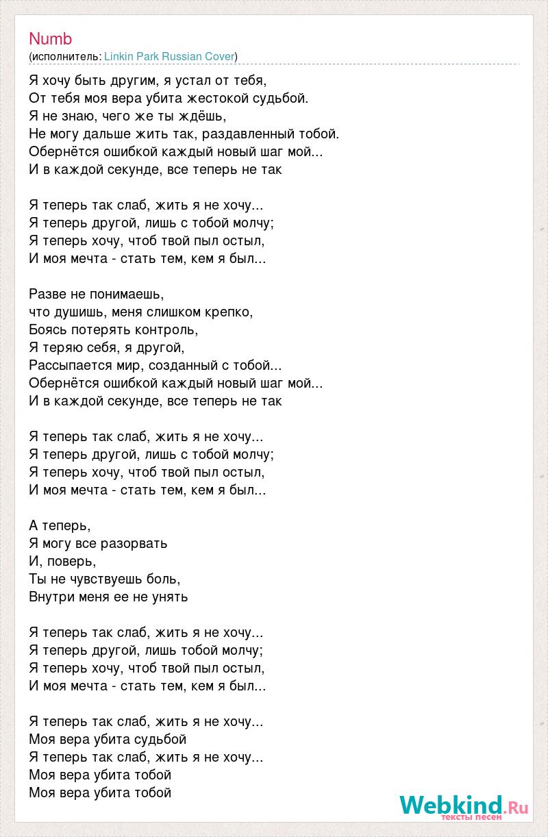 Я хочу быть другим, я устал от тебя, От тебя моя вера убита жестокой судьбой. Я не знаю, чего же ты ждёшь, Не могу дальше жить так, раздавленный тобой. Обернётся ошибкой каждый новый шаг мой... И в каждой секунде, все теперь не так Я теперь так слаб, жить я не хочу... Я теперь другой, лишь с тобой молчу; Я теперь хочу, чтоб твой пыл остыл, И моя мечта - стать тем, кем я был... Разве не понимаешь, что душишь, меня слишком крепко, Боясь потерять контроль, Я теряю себя, я другой, Рассыпается мир, созданный с тобой... Обернётся ошибкой каждый новый шаг мой... И в каждой секунде, все теперь не так Я теперь так слаб, жить я не хочу... Я теперь другой, лишь с тобой молчу; Я теперь хочу, чтоб твой пыл остыл, И моя мечта - стать тем, кем я был... А теперь, Я могу все разорвать И, поверь, Ты не чувствуешь боль, Внутри меня ее не унять Я теперь так слаб, жить я не хочу... Я теперь другой, лишь тобой молчу; Я теперь хочу, чтоб твой пыл остыл, И моя мечта - стать тем, кем я был... Я теперь так слаб, жить я не хочу... Моя вера убита судьбой Я теперь так слаб, жить я не хочу... Моя вера убита тобой Моя вера убита тобой