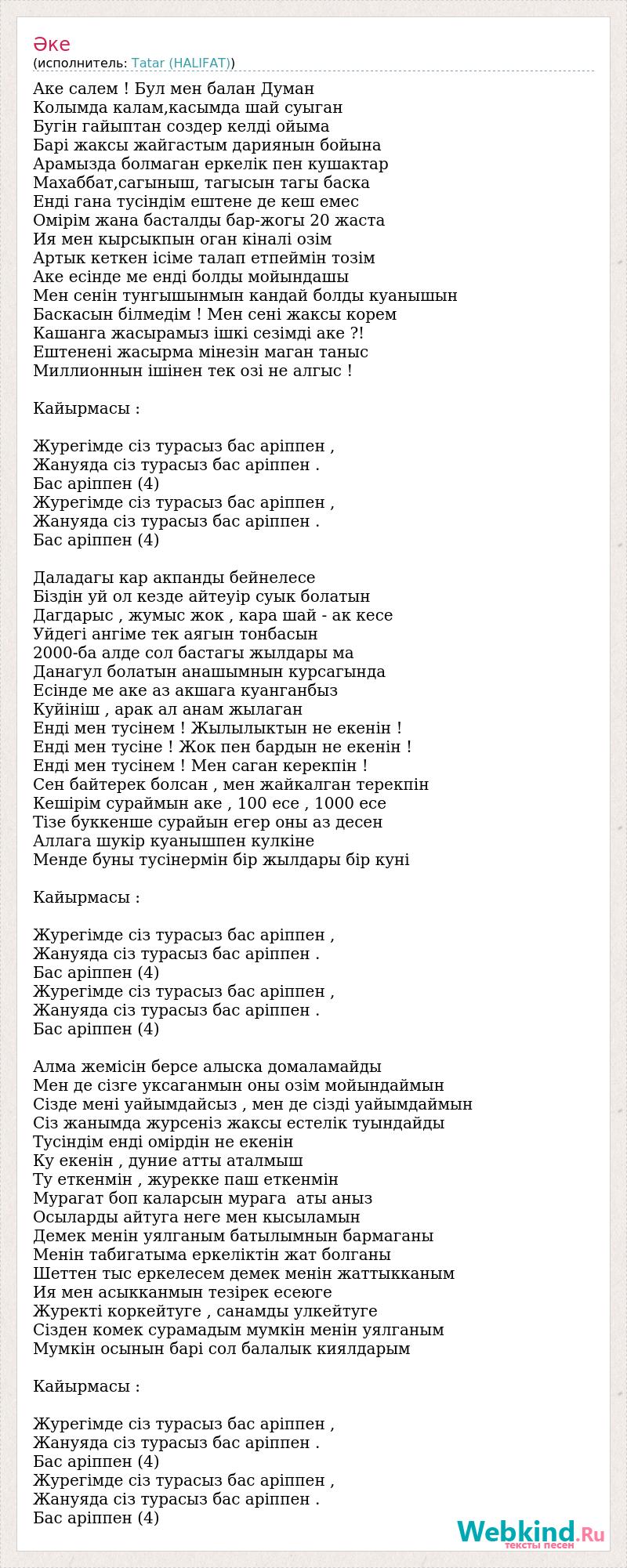 Аке салем ! Бул мен балан Думан Колымда калам,касымда шай суыган Бугiн гайыптан создер келдi ойыма Барi жаксы жайгастым дариянын бойына Арамызда болмаган еркелiк пен кушактар Махаббат,сагыныш, тагысын тагы баска Ендi гана тусiндiм ештене де кеш емес Омiрiм жана басталды бар-жогы 20 жаста Ия мен кырсыкпын оган кiналi озiм Артык кеткен iсiме талап етпеймiн тозiм Аке есiнде ме ендi болды мойындашы Мен сенiн тунгышынмын кандай болды куанышын Баскасын бiлмедiм ! Мен сенi жаксы корем Кашанга жасырамыз iшкi сезiмдi аке ?! Ештененi жасырма мiнезiн маган таныс Миллионнын iшiнен тек озi не алгыс ! Кайырмасы : Журегiмде сiз турасыз бас арiппен , Жануяда сiз турасыз бас арiппен . Бас арiппен (4) Журегiмде сiз турасыз бас арiппен , Жануяда сiз турасыз бас арiппен . Бас арiппен (4) Даладагы кар акпанды бейнелесе Бiздiн уй ол кезде айтеуiр суык болатын Дагдарыс , жумыс жок , кара шай - ак кесе Уйдегi ангiме тек аягын тонбасын 2000-ба алде сол бастагы жылдары ма Данагул болатын анашымнын курсагында Есiнде ме аке аз акшага куанганбыз Куйiнiш , арак ал анам жылаган Ендi мен тусiнем ! Жылылыктын не екенiн ! Ендi мен тусiне ! Жок пен бардын не екенiн ! Ендi мен тусiнем ! Мен саган керекпiн ! Сен байтерек болсан , мен жайкалган терекпiн Кешiрiм сураймын аке , 100 есе , 1000 есе Тiзе буккенше сурайын егер оны аз десен Аллага шукiр куанышпен кулкiне Менде буны тусiнермiн бiр жылдары бiр кунi Кайырмасы : Журегiмде сiз турасыз бас арiппен , Жануяда сiз турасыз бас арiппен . Бас арiппен (4) Журегiмде сiз турасыз бас арiппен , Жануяда сiз турасыз бас арiппен . Бас арiппен (4) Алма жемiсiн берсе алыска домаламайды Мен де сiзге уксаганмын оны озiм мойындаймын Сiзде менi уайымдайсыз , мен де сiздi уайымдаймын Сiз жанымда журсенiз жаксы естелiк туындайды Тусiндiм ендi омiрдiн не екенiн Ку екенiн , дуние атты аталмыш Ту еткенмiн , журекке паш еткенмiн Мурагат боп каларсын мурага аты аныз Осыларды айтуга неге мен кысыламын Демек менiн уялганым батылымнын бармаганы Менiн табигатыма еркелiктiн жат болганы Шеттен тыс еркелесем демек менiн жаттыкканым Ия мен асыкканмын тезiрек есеюге Журектi коркейтуге , санамды улкейтуге Сiзден комек сурамадым мумкiн менiн уялганым Мумкiн осынын барi сол балалык киялдарым Кайырмасы : Журегiмде сiз турасыз бас арiппен , Жануяда сiз турасыз бас арiппен . Бас арiппен (4) Журегiмде сiз турасыз бас арiппен , Жануяда сiз турасыз бас арiппен . Бас арiппен (4)