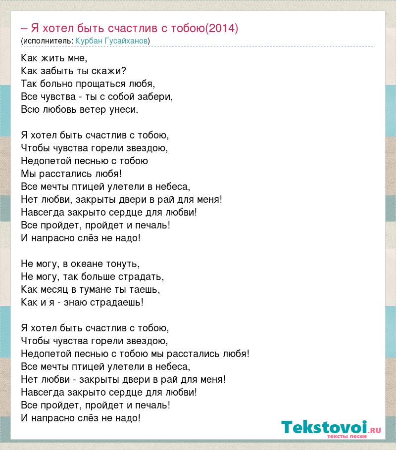Как жить мне, Как забыть ты скажи? Так больно прощаться любя, Все чувства - ты с собой забери, Всю любовь ветер унеси. Я хотел быть счастлив с тобою, Чтобы чувства горели звездою, Недопетой песнью с тобою Мы расстались любя! Все мечты птицей улетели в небеса, Нет любви, закрыты двери в рай для меня! Навсегда закрыто сердце для любви! Все пройдет, пройдет и печаль! И напрасно слёз не надо! Не могу, в океане тонуть, Не могу, так больше страдать, Как месяц в тумане ты таешь, Как и я - знаю страдаешь! Я хотел быть счастлив с тобою, Чтобы чувства горели звездою, Недопетой песнью с тобою мы расстались любя! Все мечты птицей улетели в небеса, Нет любви - закрыты двери в рай для меня! Навсегда закрыто сердце для любви! Все пройдет, пройдет и печаль! И напрасно слёз не надо!