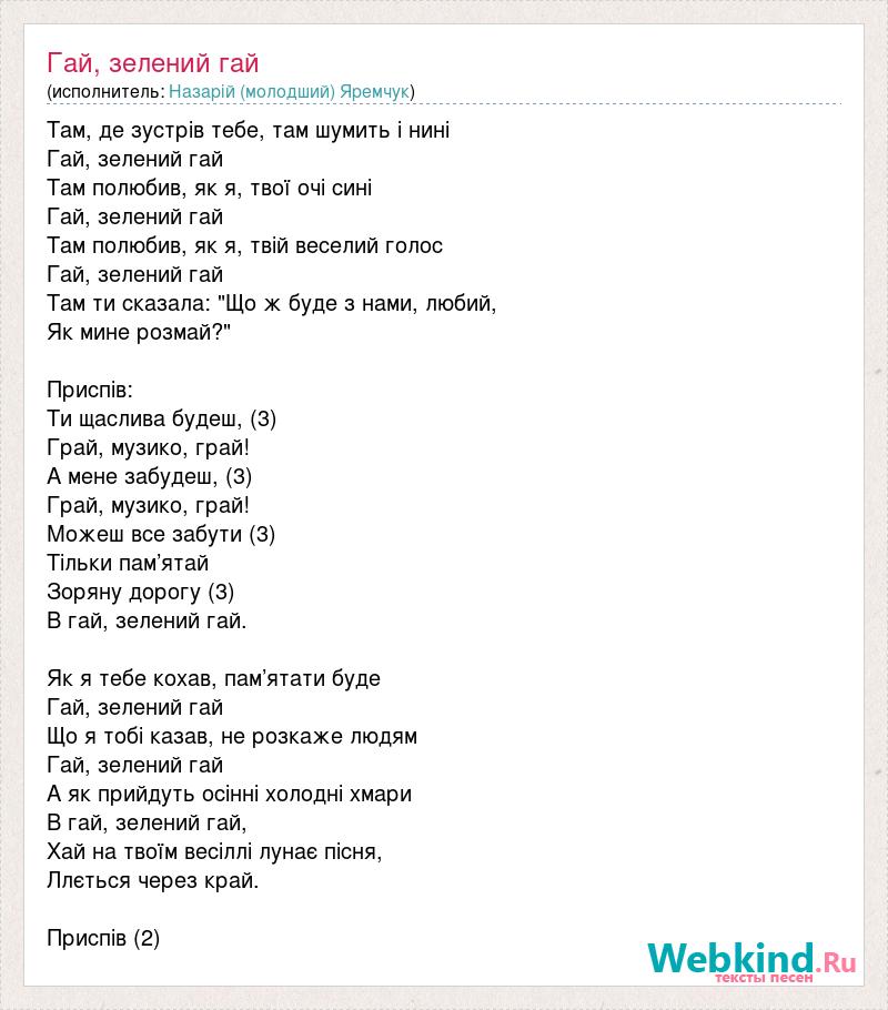 Там, де зустрів тебе, там шумить і нині Гай, зелений гай Там полюбив, як я, твої очі сині Гай, зелений гай Там полюбив, як я, твій веселий голос Гай, зелений гай Там ти сказала: "Що ж буде з нами, любий, Як мине розмай?" Приспів: Ти щаслива будеш, (3) Грай, музико, грай! А мене забудеш, (3) Грай, музико, грай! Можеш все забути (3) Тільки пам’ятай Зоряну дорогу (3) В гай, зелений гай. Як я тебе кохав, пам’ятати буде Гай, зелений гай Що я тобі казав, не розкаже людям Гай, зелений гай А як прийдуть осінні холодні хмари В гай, зелений гай, Хай на твоїм весіллі лунає пісня, Ллється через край. Приспів (2)