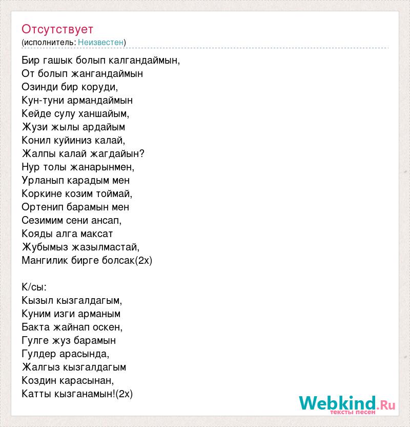 Бир гашык болып калгандаймын, От болып жангандаймын Озинди бир коруди, Кун-туни армандаймын Кейде сулу ханшайым, Жузи жылы ардайым Конил куйиниз калай, Жалпы калай жагдайын? Нур толы жанарынмен, Урланып карадым мен Коркине козим тоймай, Ортенип барамын мен Сезимим сени ансап, Кояды алга максат Жубымыз жазылмастай, Мангилик бирге болсак(2х) К/сы: Кызыл кызгалдагым, Куним изги арманым Бакта жайнап оскен, Гулге жуз барамын Гулдер арасында, Жалгыз кызгалдагым Коздин карасынан, Катты кызганамын!(2х)
