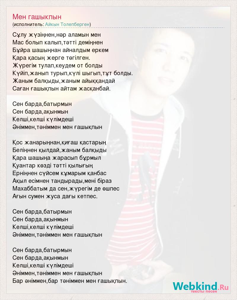 Сұлу жүзіңнен,нәр аламын мен Мас болып калып,тәтті деміңнен Бұйра шашыңнан айналдым еркем Қара қасың жерге төгілген. Жүрегім тулап,кеудем от болды Күйіп,жанып турып,күлі шыгып,тұт болды. Жаным балқыды,жаным айыққандай Саған ғашықпын айтам жасқанбай. Сен барда,батырмын Сен барда,ақынмын Келші,келші күлімдеші Әніммен,тәніммен мен ғашықпын Қос жанарыңнан,қиғаш қастарың Беліңнен қылдай,жаным балқыды Қара шашыңа жарасып бұрмыл Қуантар көзді тәтті қылығың Ерніңнен сүйсем кұмарым қанбас Ақыл есімнен тандырады,мені біраз Махаббатым да сен,жүрегім де өшпес Ағын сумен жуса дағы кетпес. Сен барда,батырмын Сен барда,ақынмын Келші,келші күлімдеші Әніммен,тәніммен мен ғашықпын Сен барда,батырмын Сен барда,ақынмын Келші,келші күлімдеші Әніммен,тәніммен мен ғашықпын Бар әніммен,бар тәніммен мен ғашықпын.