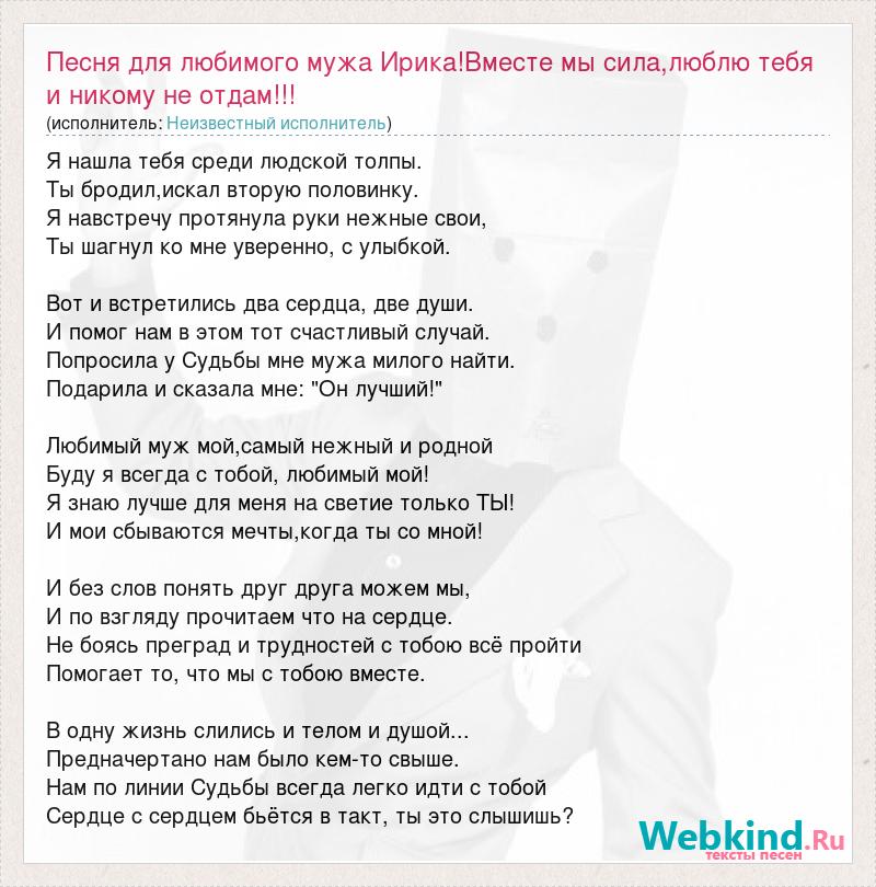А как ты думаешь, о чем песня "Песня для любимого мужа Ирика!Вместе мы сила,люблю тебя и никому не отда" ?