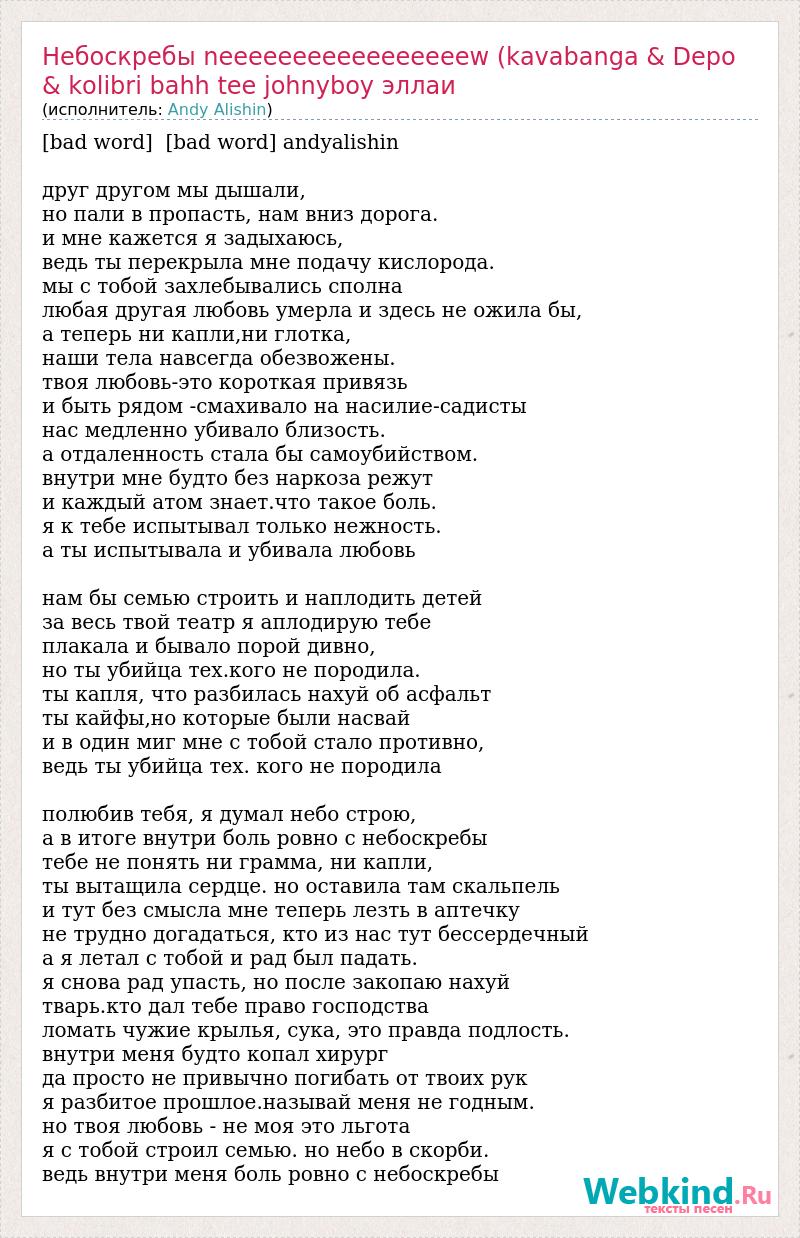 [bad word] [bad word] andyalishin друг другом мы дышали, но пали в пропасть, нам вниз дорога. и мне кажется я задыхаюсь, ведь ты перекрыла мне подачу кислорода. мы с тобой захлебывались сполна любая другая любовь умерла и здесь не ожила бы, а теперь ни капли,ни глотка, наши тела навсегда обезвожены. твоя любовь-это короткая привязь и быть рядом -смахивало на насилие-садисты нас медленно убивало близость. а отдаленность стала бы самоубийством. внутри мне будто без наркоза режут и каждый атом знает.что такое боль. я к тебе испытывал только нежность. а ты испытывала и убивала любовь нам бы семью строить и наплодить детей за весь твой театр я аплодирую тебе плакала и бывало порой дивно, но ты убийца тех.кого не породила. ты капля, что разбилась нахуй об асфальт ты кайфы,но которые были насвай и в один миг мне с тобой стало противно, ведь ты убийца тех. кого не породила полюбив тебя, я думал небо строю, а в итоге внутри боль ровно с небоскребы тебе не понять ни грамма, ни капли, ты вытащила сердце. но оставила там скальпель и тут без смысла мне теперь лезть в аптечку не трудно догадаться, кто из нас тут бессердечный а я летал с тобой и рад был падать. я снова рад упасть, но после закопаю нахуй тварь.кто дал тебе право господства ломать чужие крылья, сука, это правда подлость. внутри меня будто копал хирург да просто не привычно погибать от твоих рук я разбитое прошлое.называй меня не годным. но твоя любовь - не моя это льгота я с тобой строил семью. но небо в скорби. ведь внутри меня боль ровно с небоскребы