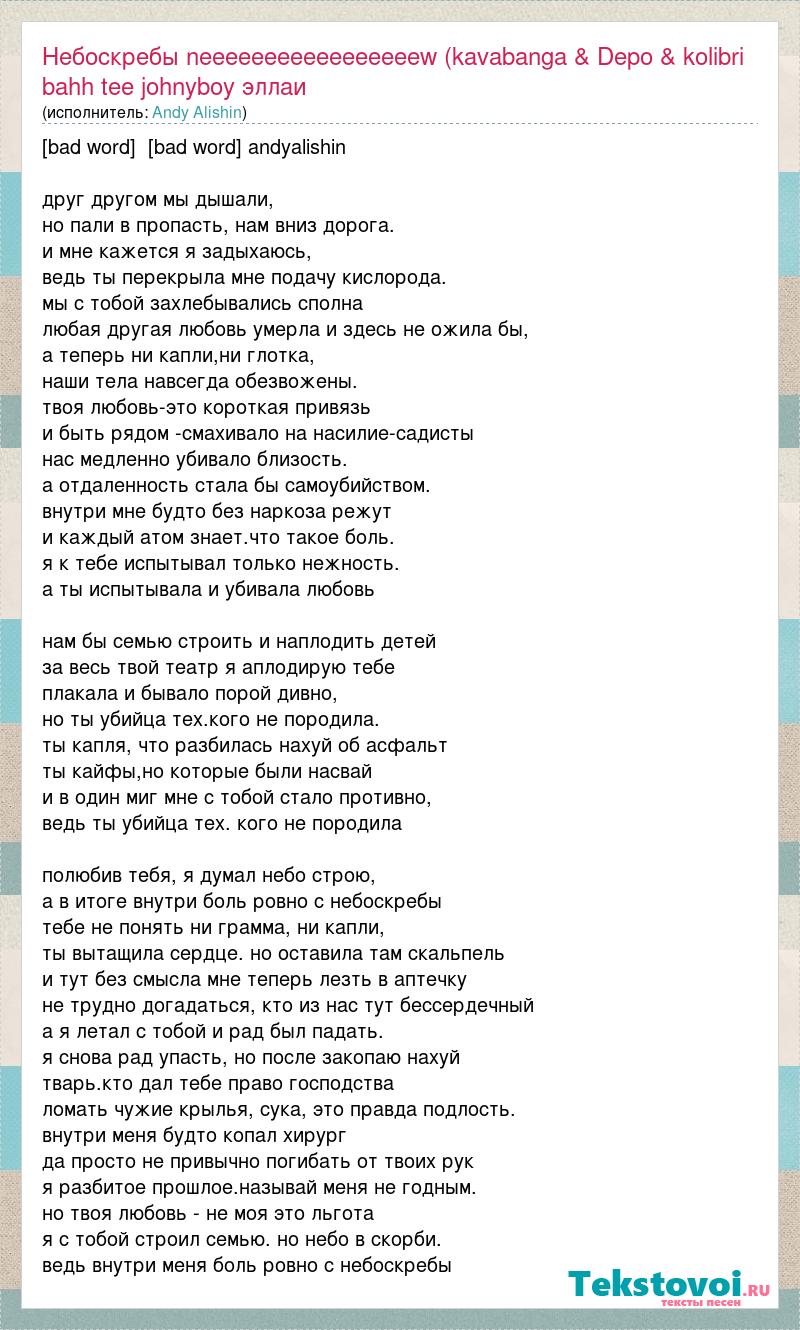 [bad word] [bad word] andyalishin друг другом мы дышали, но пали в пропасть, нам вниз дорога. и мне кажется я задыхаюсь, ведь ты перекрыла мне подачу кислорода. мы с тобой захлебывались сполна любая другая любовь умерла и здесь не ожила бы, а теперь ни капли,ни глотка, наши тела навсегда обезвожены. твоя любовь-это короткая привязь и быть рядом -смахивало на насилие-садисты нас медленно убивало близость. а отдаленность стала бы самоубийством. внутри мне будто без наркоза режут и каждый атом знает.что такое боль. я к тебе испытывал только нежность. а ты испытывала и убивала любовь нам бы семью строить и наплодить детей за весь твой театр я аплодирую тебе плакала и бывало порой дивно, но ты убийца тех.кого не породила. ты капля, что разбилась нахуй об асфальт ты кайфы,но которые были насвай и в один миг мне с тобой стало противно, ведь ты убийца тех. кого не породила полюбив тебя, я думал небо строю, а в итоге внутри боль ровно с небоскребы тебе не понять ни грамма, ни капли, ты вытащила сердце. но оставила там скальпель и тут без смысла мне теперь лезть в аптечку не трудно догадаться, кто из нас тут бессердечный а я летал с тобой и рад был падать. я снова рад упасть, но после закопаю нахуй тварь.кто дал тебе право господства ломать чужие крылья, сука, это правда подлость. внутри меня будто копал хирург да просто не привычно погибать от твоих рук я разбитое прошлое.называй меня не годным. но твоя любовь - не моя это льгота я с тобой строил семью. но небо в скорби. ведь внутри меня боль ровно с небоскребы
