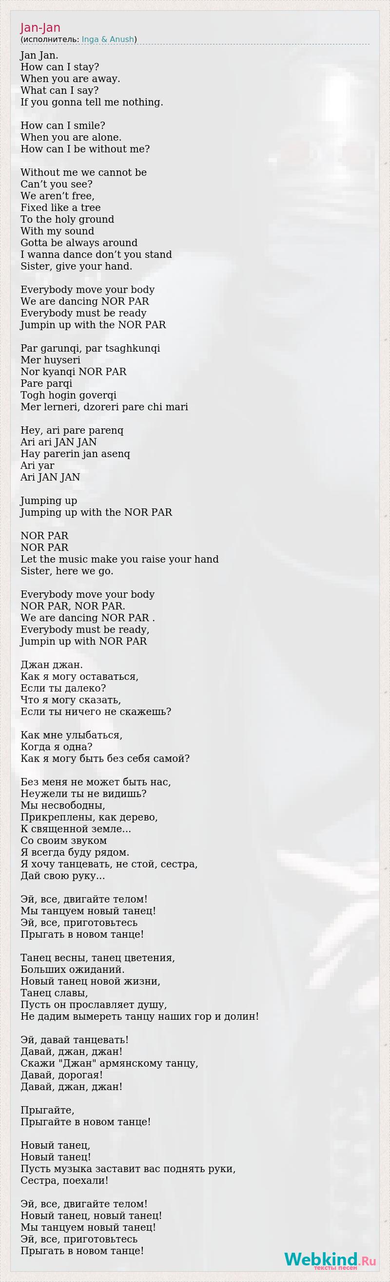 Jan Jan. How can I stay? When you are away. What can I say? If you gonna tell me nothing. How can I smile? When you are alone. How can I be without me? Without me we cannot be Can’t you see? We aren’t free, Fixed like a tree To the holy ground With my sound Gotta be always around I wanna dance don’t you stand Sister, give your hand. Everybody move your body We are dancing NOR PAR Everybody must be ready Jumpin up with the NOR PAR Par garunqi, par tsaghkunqi Mer huyseri Nor kyanqi NOR PAR Pare parqi Togh hogin goverqi Mer lerneri, dzoreri pare chi mari Hey, ari pare parenq Ari ari JAN JAN Hay parerin jan asenq Ari yar Ari JAN JAN Jumping up Jumping up with the NOR PAR NOR PAR NOR PAR Let the music make you raise your hand Sister, here we go. Everybody move your body NOR PAR, NOR PAR. We are dancing NOR PAR . Everybody must be ready, Jumpin up with NOR PAR Джан джан. Как я могу оставаться, Если ты далеко? Что я могу сказать, Если ты ничего не скажешь? Как мне улыбаться, Когда я одна? Как я могу быть без себя самой? Без меня не может быть нас, Неужели ты не видишь? Мы несвободны, Прикреплены, как дерево, К священной земле... Со своим звуком Я всегда буду рядом. Я хочу танцевать, не стой, сестра, Дай свою руку... Эй, все, двигайте телом! Мы танцуем новый танец! Эй, все, приготовьтесь Прыгать в новом танце! Танец весны, танец цветения, Больших ожиданий. Новый танец новой жизни, Танец славы, Пусть он прославляет душу, Не дадим вымереть танцу наших гор и долин! Эй, давай танцевать! Давай, джан, джан! Скажи "Джан" армянскому танцу, Давай, дорогая! Давай, джан, джан! Прыгайте, Прыгайте в новом танце! Новый танец, Новый танец! Пусть музыка заставит вас поднять руки, Сестра, поехали! Эй, все, двигайте телом! Новый танец, новый танец! Мы танцуем новый танец! Эй, все, приготовьтесь Прыгать в новом танце!