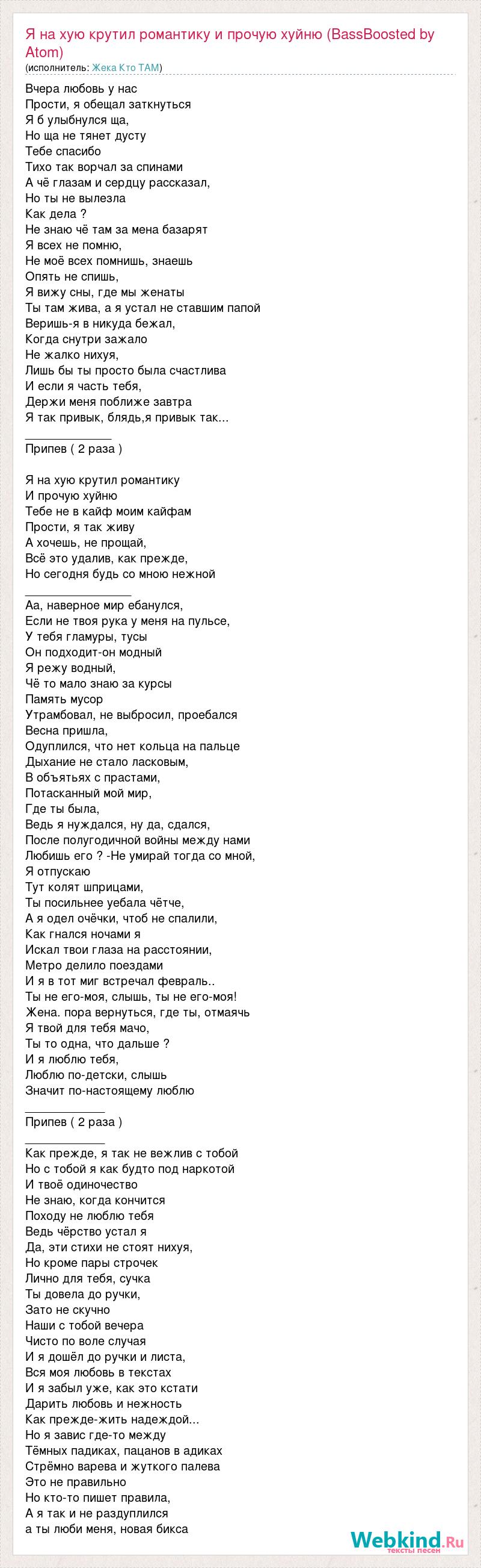 Вчера любовь у нас Прости, я обещал заткнуться Я б улыбнулся ща, Но ща не тянет дусту Тебе спасибо Тихо так ворчал за спинами А чё глазам и сердцу рассказал, Но ты не вылезла Как дела ? Не знаю чё там за мена базарят Я всех не помню, Не моё всех помнишь, знаешь Опять не спишь, Я вижу сны, где мы женаты Ты там жива, а я устал не ставшим папой Веришь-я в никуда бежал, Когда снутри зажало Не жалко нихуя, Лишь бы ты просто была счастлива И если я часть тебя, Держи меня поближе завтра Я так привык, блядь,я привык так... _____________ Припев ( 2 раза ) Я на хую крутил романтику И прочую хуйню Тебе не в кайф моим кайфам Прости, я так живу А хочешь, не прощай, Всё это удалив, как прежде, Но сегодня будь со мною нежной ________________ Аа, наверное мир ебанулся, Если не твоя рука у меня на пульсе, У тебя гламуры, тусы Он подходит-он модный Я режу водный, Чё то мало знаю за курсы Память мусор Утрамбовал, не выбросил, проебался Весна пришла, Одуплился, что нет кольца на пальце Дыхание не стало ласковым, В объятьях с прастами, Потасканный мой мир, Где ты была, Ведь я нуждался, ну да, сдался, После полугодичной войны между нами Любишь его ? -Не умирай тогда со мной, Я отпускаю Тут колят шприцами, Ты посильнее уебала чётче, А я одел очёчки, чтоб не спалили, Как гнался ночами я Искал твои глаза на расстоянии, Метро делило поездами И я в тот миг встречал февраль.. Ты не его-моя, слышь, ты не его-моя! Жена. пора вернуться, где ты, отмаячь Я твой для тебя мачо, Ты то одна, что дальше ? И я люблю тебя, Люблю по-детски, слышь Значит по-настоящему люблю ____________ Припев ( 2 раза ) ____________ Как прежде, я так не вежлив с тобой Но с тобой я как будто под наркотой И твоё одиночество Не знаю, когда кончится Походу не люблю тебя Ведь чёрство устал я Да, эти стихи не стоят нихуя, Но кроме пары строчек Лично для тебя, сучка Ты довела до ручки, Зато не скучно Наши с тобой вечера Чисто по воле случая И я дошёл до ручки и листа, Вся моя любовь в текстах И я забыл уже, как это кстати Дарить любовь и нежность Как прежде-жить надеждой... Но я завис где-то между Тёмных падиках, пацанов в адиках Стрёмно варева и жуткого палева Это не правильно Но кто-то пишет правила, А я так и не раздуплился а ты люби меня, новая бикса