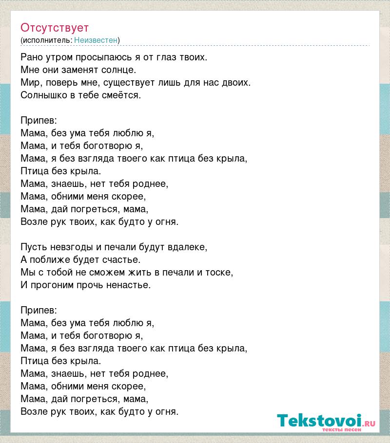 Рано утром просыпаюсь я от глаз твоих. Мне они заменят солнце. Мир, поверь мне, существует лишь для нас двоих. Солнышко в тебе смеётся. Припев: Мама, без ума тебя люблю я, Мама, и тебя боготворю я, Мама, я без взгляда твоего как птица без крыла, Птица без крыла. Мама, знаешь, нет тебя роднее, Мама, обними меня скорее, Мама, дай погреться, мама, Возле рук твоих, как будто у огня. Пусть невзгоды и печали будут вдалеке, А поближе будет счастье. Мы с тобой не сможем жить в печали и тоске, И прогоним прочь ненастье. Припев: Мама, без ума тебя люблю я, Мама, и тебя боготворю я, Мама, я без взгляда твоего как птица без крыла, Птица без крыла. Мама, знаешь, нет тебя роднее, Мама, обними меня скорее, Мама, дай погреться, мама, Возле рук твоих, как будто у огня.