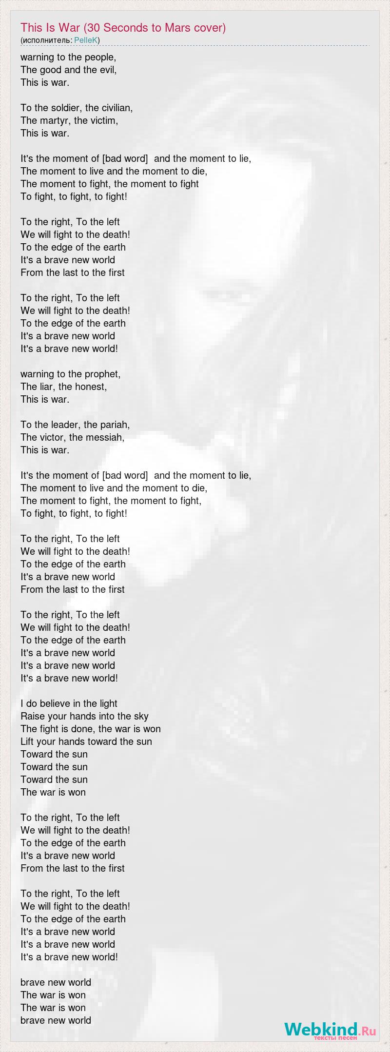 warning to the people, The good and the evil, This is war. To the soldier, the civilian, The martyr, the victim, This is war. It's the moment of [bad word] and the moment to lie, The moment to live and the moment to die, The moment to fight, the moment to fight To fight, to fight, to fight! To the right, To the left We will fight to the death! To the edge of the earth It's a brave new world From the last to the first To the right, To the left We will fight to the death! To the edge of the earth It's a brave new world It's a brave new world! warning to the prophet, The liar, the honest, This is war. To the leader, the pariah, The victor, the messiah, This is war. It's the moment of [bad word] and the moment to lie, The moment to live and the moment to die, The moment to fight, the moment to fight, To fight, to fight, to fight! To the right, To the left We will fight to the death! To the edge of the earth It's a brave new world From the last to the first To the right, To the left We will fight to the death! To the edge of the earth It's a brave new world It's a brave new world It's a brave new world! I do believe in the light Raise your hands into the sky The fight is done, the war is won Lift your hands toward the sun Toward the sun Toward the sun Toward the sun The war is won To the right, To the left We will fight to the death! To the edge of the earth It's a brave new world From the last to the first To the right, To the left We will fight to the death! To the edge of the earth It's a brave new world It's a brave new world It's a brave new world! brave new world The war is won The war is won brave new world