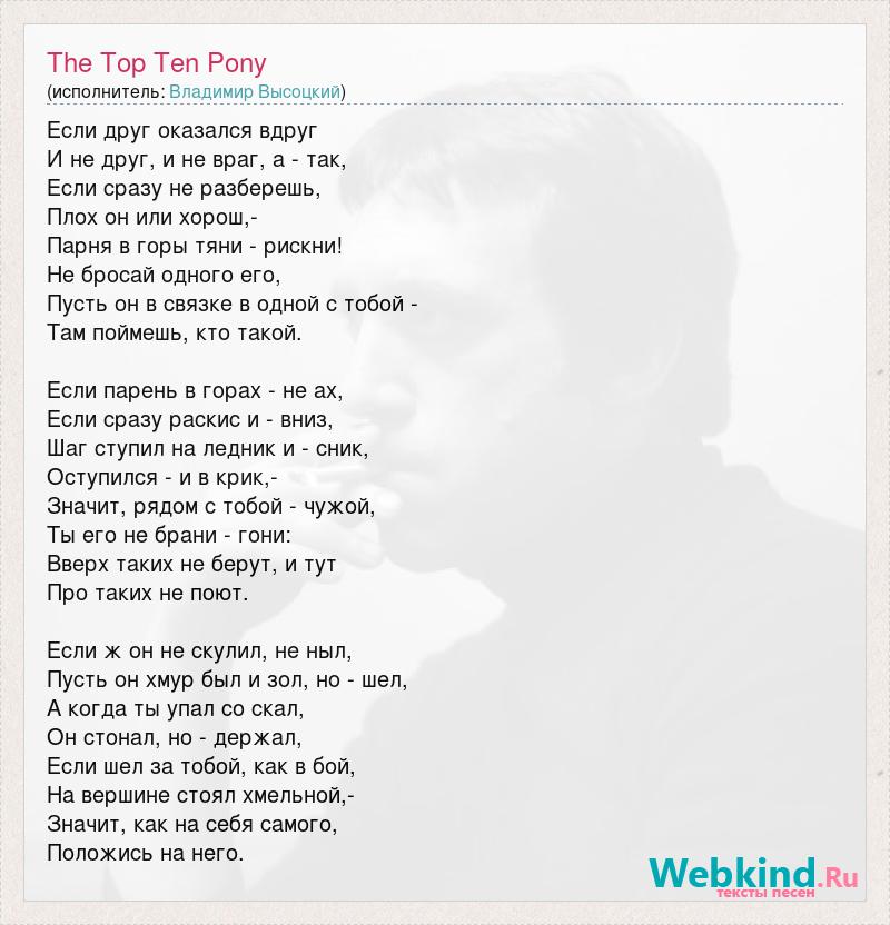 Если друг оказался вдруг И не друг, и не враг, а - так, Если сразу не разберешь, Плох он или хорош,- Парня в горы тяни - рискни! Не бросай одного его, Пусть он в связке в одной с тобой - Там поймешь, кто такой. Если парень в горах - не ах, Если сразу раскис и - вниз, Шаг ступил на ледник и - сник, Оступился - и в крик,- Значит, рядом с тобой - чужой, Ты его не брани - гони: Вверх таких не берут, и тут Про таких не поют. Если ж он не скулил, не ныл, Пусть он хмур был и зол, но - шел, А когда ты упал со скал, Он стонал, но - держал, Если шел за тобой, как в бой, На вершине стоял хмельной,- Значит, как на себя самого, Положись на него.