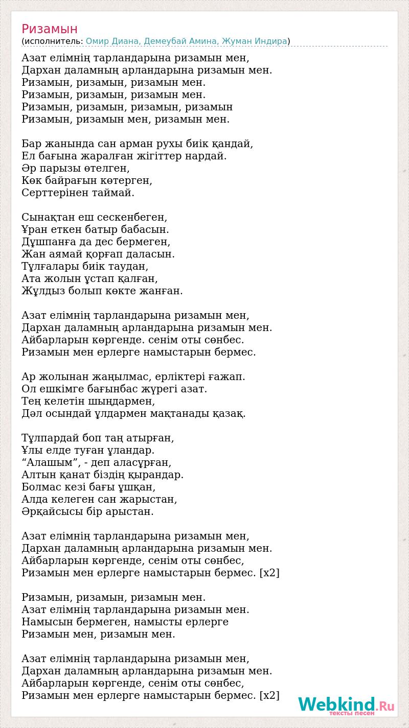 Азат елімнің тарландарына ризамын мен, Дархан даламның арландарына ризамын мен. Ризамын, ризамын, ризамын мен. Ризамын, ризамын, ризамын мен. Ризамын, ризамын, ризамын, ризамын Ризамын, ризамын мен, ризамын мен. Бар жанында сан арман рухы биік қандай, Ел бағына жаралған жігіттер нардай. Әр парызы өтелген, Көк байрағын көтерген, Серттерінен таймай. Сынақтан еш сескенбеген, Ұран еткен батыр бабасын. Дұшпанға да дес бермеген, Жан аямай қорғап даласын. Тұлғалары биік таудан, Ата жолын ұстап қалған, Жұлдыз болып көкте жанған. Азат елімнің тарландарына ризамын мен, Дархан даламның арландарына ризамын мен. Айбарларын көргенде. сенім оты сөнбес. Ризамын мен ерлерге намыстарын бермес. Ар жолынан жаңылмас, ерліктері ғажап. Ол ешкімге бағынбас жүрегі азат. Тең келетін шыңдармен, Дәл осындай ұлдармен мақтанады қазақ. Тұлпардай боп таң атырған, Ұлы елде туған ұландар. “Алашым”, - деп аласұрған, Алтын қанат біздің қырандар. Болмас кезі бағы ұшқан, Алда келеген сан жарыстан, Әрқайсысы бір арыстан. Азат елімнің тарландарына ризамын мен, Дархан даламның арландарына ризамын мен. Айбарларын көргенде, сенім оты сөнбес, Ризамын мен ерлерге намыстарын бермес. [x2] Ризамын, ризамын, ризамын мен. Азат елімнің тарландарына ризамын мен. Намысын бермеген, намысты ерлерге Ризамын мен, ризамын мен. Азат елімнің тарландарына ризамын мен, Дархан даламның арландарына ризамын мен. Айбарларын көргенде, сенім оты сөнбес, Ризамын мен ерлерге намыстарын бермес. [x2]