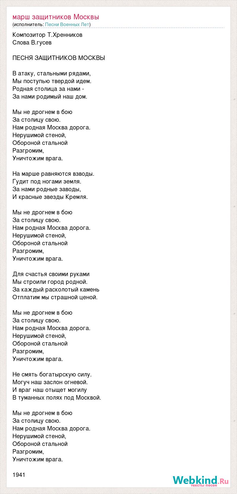 Композитор Т.Хренников Слова В.гусев ПЕСНЯ ЗАЩИТНИКОВ МОСКВЫ В атаку, стальными рядами, Мы поступью твердой идем. Родная столица за нами - За нами родимый наш дом. Мы не дрогнем в бою За столицу свою. Нам родная Москва дорога. Нерушимой стеной, Обороной стальной Разгромим, Уничтожим врага. На марше равняются взводы. Гудит под ногами земля. За нами родные заводы, И красные звезды Кремля. Мы не дрогнем в бою За столицу свою. Нам родная Москва дорога. Нерушимой стеной, Обороной стальной Разгромим, Уничтожим врага. Для счастья своими руками Мы строили город родной. За каждый расколотый камень Отплатим мы страшной ценой. Мы не дрогнем в бою За столицу свою. Нам родная Москва дорога. Нерушимой стеной, Обороной стальной Разгромим, Уничтожим врага. Не смять богатырскую силу. Могуч наш заслон огневой. И враг наш отыщет могилу В туманных полях под Москвой. Мы не дрогнем в бою За столицу свою. Нам родная Москва дорога. Нерушимой стеной, Обороной стальной Разгромим, Уничтожим врага. 1941
