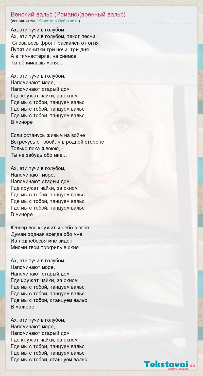 Ах, эти тучи в голубом Ах, эти тучи в голубом, текст песни: Снова весь фронт раскален от огня Лупят зенитки три ночи, три дня А в гимнастерке, на снимке Ты обнимаешь меня... Ах, эти тучи в голубом, Напоминают море, Напоминают старый дом Где кружат чайки, за окном Где мы с тобой, танцуем вальс Где мы с тобой, танцуем вальс Где мы с тобой, танцуем вальс В миноре Если останусь живым на войне Встречусь с тобой, я в родной стороне Только пока я воюю, - Ты не забудь обо мне... Ах, эти тучи в голубом, Напоминают море, Напоминают старый дом Где кружат чайки, за окном Где мы с тобой, танцуем вальс Где мы с тобой, танцуем вальс Где мы с тобой, танцуем вальс В миноре Юнкер все кружит и небо в огне Думай родная всегда обо мне Из-поднебесья мне виден Милый твой профиль в окне... Ах, эти тучи в голубом, Напоминают море, Напоминают старый дом Где кружат чайки, за окном Где мы с тобой, танцуем вальс Где мы с тобой, танцуем вальс Где мы с тобой, станцуем вальс В мажоре Ах, эти тучи в голубом, Напоминают море, Напоминают старый дом Где кружат чайки, за окном Где мы с тобой, танцуем вальс Где мы с тобой, танцуем вальс Где мы с тобой, станцуем вальс