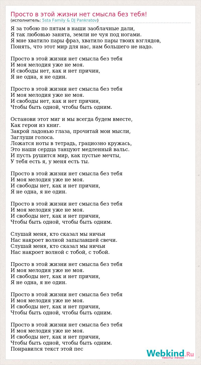 Я за тобою по пятам в наши заоблачные дали, Я так любовью занята, земли не чуя под ногами. Я мне хватило пары фраз, хватило пары твоих взглядов, Понять, что этот мир для нас, нам большего не надо. Просто в этой жизни нет смысла без тебя И моя мелодия уже не моя. И свободы нет, как и нет причин, Я не одна, я не один. Просто в этой жизни нет смысла без тебя И моя мелодия уже не моя. И свободы нет, как и нет причин, Чтобы быть одной, чтобы быть одним. Останови этот миг и мы всегда будем вместе, Как герои из книг. Закрой ладонью глаза, прочитай мои мысли, Заглуши голоса. Ложатся ноты в тетрадь, грациозно кружась, Это наши сердца танцуют медленный вальс. И пусть рушится мир, как пустые мечты, У тебя есть я, у меня есть ты. Просто в этой жизни нет смысла без тебя И моя мелодия уже не моя. И свободы нет, как и нет причин, Я не одна, я не один. Просто в этой жизни нет смысла без тебя И моя мелодия уже не моя. И свободы нет, как и нет причин, Чтобы быть одной, чтобы быть одним. Слушай меня, кто сказал мы ничьи Нас накроет волной запылавшей свечи. Слушай меня, кто сказал мы ничьи Нас накроет волной с тобой, с тобой. Просто в этой жизни нет смысла без тебя И моя мелодия уже не моя. И свободы нет, как и нет причин, Я не одна, я не один. Просто в этой жизни нет смысла без тебя И моя мелодия уже не моя. И свободы нет, как и нет причин, Чтобы быть одной, чтобы быть одним. Просто в этой жизни нет смысла без тебя И моя мелодия уже не моя. И свободы нет, как и нет причин, Чтобы быть одной, чтобы быть одним. Понравился текст этой пес