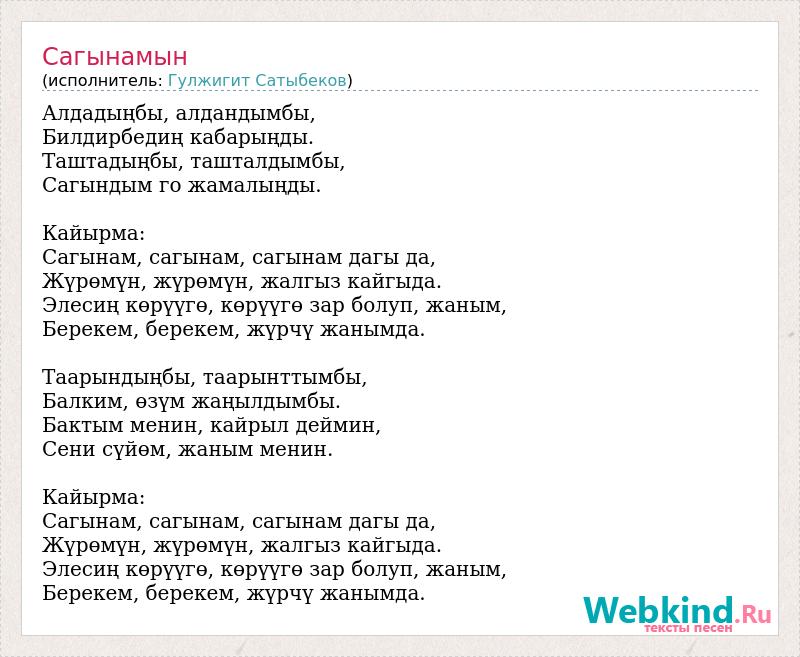 Алдадыңбы, алдандымбы, Билдирбедиң кабарыңды. Таштадыңбы, ташталдымбы, Сагындым го жамалыңды. Кайырма: Сагынам, сагынам, сагынам дагы да, Жүрөмүн, жүрөмүн, жалгыз кайгыда. Элесиң көрүүгө, көрүүгө зар болуп, жаным, Берекем, берекем, жүрчү жанымда. Таарындыңбы, таарынттымбы, Балким, өзүм жаңылдымбы. Бактым менин, кайрыл деймин, Сени сүйөм, жаным менин. Кайырма: Сагынам, сагынам, сагынам дагы да, Жүрөмүн, жүрөмүн, жалгыз кайгыда. Элесиң көрүүгө, көрүүгө зар болуп, жаным, Берекем, берекем, жүрчү жанымда.