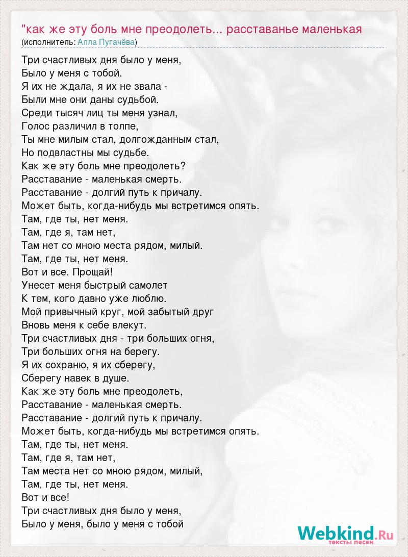 Три счастливых дня было у меня, Было у меня с тобой. Я их не ждала, я их не звала - Были мне они даны судьбой. Среди тысяч лиц ты меня узнал, Голос различил в толпе, Ты мне милым стал, долгожданным стал, Но подвластны мы судьбе. Как же эту боль мне преодолеть? Расставание - маленькая смерть. Расставание - долгий путь к причалу. Может быть, когда-нибудь мы встретимся опять. Там, где ты, нет меня. Там, где я, там нет, Там нет со мною места рядом, милый. Там, где ты, нет меня. Вот и все. Прощай! Унесет меня быстрый самолет К тем, кого давно уже люблю. Мой привычный круг, мой забытый друг Вновь меня к себе влекут. Три счастливых дня - три больших огня, Три больших огня на берегу. Я их сохраню, я их сберегу, Сберегу навек в душе. Как же эту боль мне преодолеть, Расставание - маленькая смерть. Расставание - долгий путь к причалу. Может быть, когда-нибудь мы встретимся опять. Там, где ты, нет меня. Там, где я, там нет, Там места нет со мною рядом, милый, Там, где ты, нет меня. Вот и все! Три счастливых дня было у меня, Было у меня, было у меня с тобой