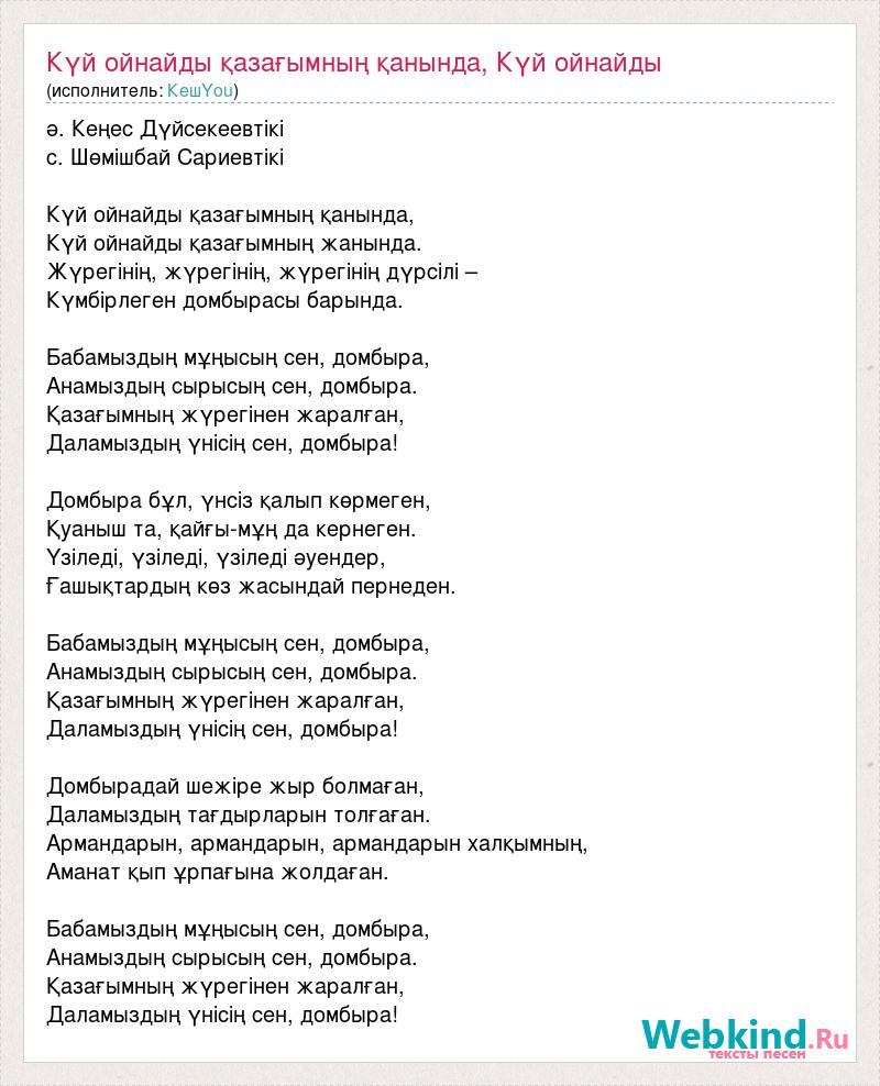 ә. Кеңес Дүйсекеевтікі с. Шөмішбай Сариевтікі Күй ойнайды қазағымның қанында, Күй ойнайды қазағымның жанында. Жүрегінің, жүрегінің, жүрегінің дүрсілі – Күмбірлеген домбырасы барында. Бабамыздың мұңысың сен, домбыра, Анамыздың сырысың сен, домбыра. Қазағымның жүрегінен жаралған, Даламыздың үнісің сен, домбыра! Домбыра бұл, үнсіз қалып көрмеген, Қуаныш та, қайғы-мұң да кернеген. Үзіледі, үзіледі, үзіледі әуендер, Ғашықтардың көз жасындай пернеден. Бабамыздың мұңысың сен, домбыра, Анамыздың сырысың сен, домбыра. Қазағымның жүрегінен жаралған, Даламыздың үнісің сен, домбыра! Домбырадай шежіре жыр болмаған, Даламыздың тағдырларын толғаған. Армандарын, армандарын, армандарын халқымның, Аманат қып ұрпағына жолдаған. Бабамыздың мұңысың сен, домбыра, Анамыздың сырысың сен, домбыра. Қазағымның жүрегінен жаралған, Даламыздың үнісің сен, домбыра!