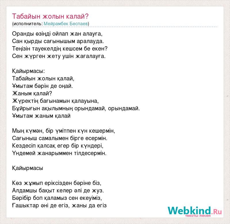 Оранды өзiңдi ойлап жан алауға, Сан қырды сағынышым аралауда. Теңiзiн тауекелдiң кешсем бе екен? Сен жүрген жету ушiн жағалауға. Қайырмасы: Табайын жолын қалай, Ұмытам бәрiн де оңай. Жаным қалай? Жүректiң бағынамын қалауына, Бұйрығын ақылымның орындамай, орындамай. Ұмытам жаным қалай Мың күмән, бiр үмiтпен күн кешермiн, Сағыныш самалымен бiрге есермiн. Кездесiп қалсақ егер бiр күндерi, Үндемей жанарыммен тiлдесермiн. Қайырмасы Көз жұмып ерiксiзден бәрiне бiз, Алдамшы бақыт келер әлi де жуз. Бәрiбiр боп қаламыз сен екеуiмiз, Ғашыктар әнi де егiз, жаны да егiз