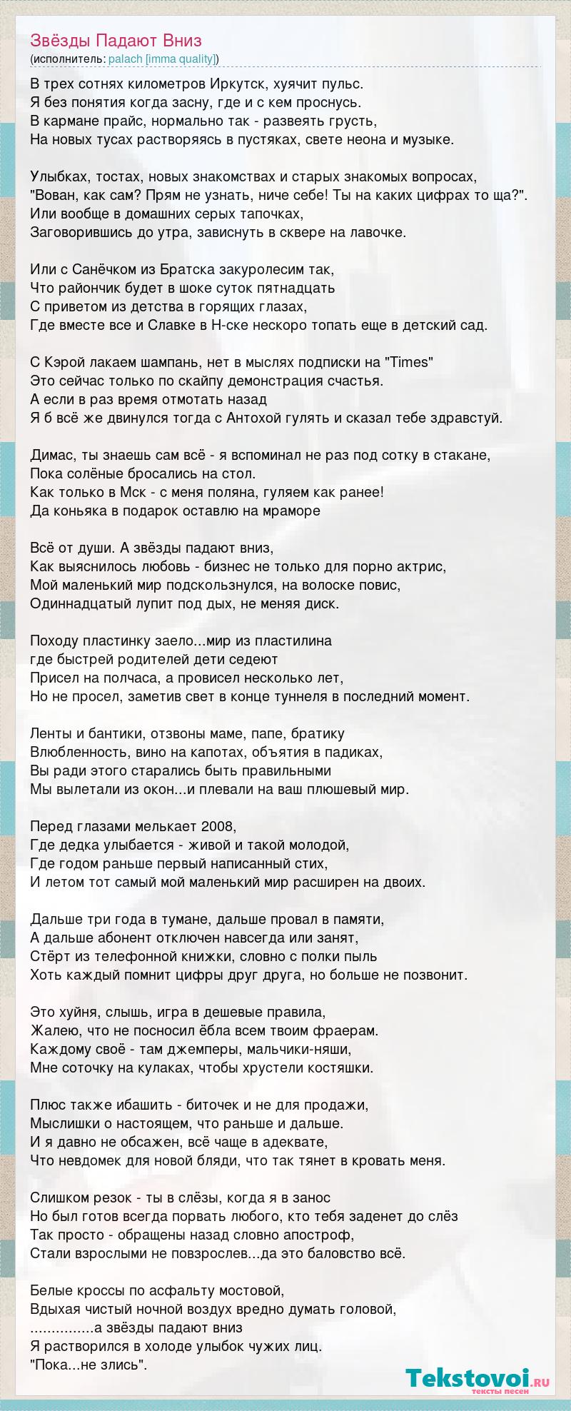 В трех сотнях километров Иркутск, хуячит пульс. Я без понятия когда засну, где и с кем проснусь. В кармане прайс, нормально так - развеять грусть, На новых тусах растворяясь в пустяках, свете неона и музыке. Улыбках, тостах, новых знакомствах и старых знакомых вопросах, "Вован, как сам? Прям не узнать, ниче себе! Ты на каких цифрах то ща?". Или вообще в домашних серых тапочках, Заговорившись до утра, зависнуть в сквере на лавочке. Или с Санёчком из Братска закуролесим так, Что райончик будет в шоке суток пятнадцать С приветом из детства в горящих глазах, Где вместе все и Славке в Н-ске нескоро топать еще в детский сад. С Кэрой лакаем шампань, нет в мыслях подписки на "Times" Это сейчас только по скайпу демонстрация счастья. А если в раз время отмотать назад Я б всё же двинулся тогда с Антохой гулять и сказал тебе здравстуй. Димас, ты знаешь сам всё - я вспоминал не раз под сотку в стакане, Пока солёные бросались на стол. Как только в Мск - с меня поляна, гуляем как ранее! Да коньяка в подарок оставлю на мраморе Всё от души. А звёзды падают вниз, Как выяснилось любовь - бизнес не только для порно актрис, Мой маленький мир подскользнулся, на волоске повис, Одиннадцатый лупит под дых, не меняя диск. Походу пластинку заело...мир из пластилина где быстрей родителей дети седеют Присел на полчаса, а провисел несколько лет, Но не просел, заметив свет в конце туннеля в последний момент. Ленты и бантики, отзвоны маме, папе, братику Влюбленность, вино на капотах, объятия в падиках, Вы ради этого старались быть правильными Мы вылетали из окон...и плевали на ваш плюшевый мир. Перед глазами мелькает 2008, Где дедка улыбается - живой и такой молодой, Где годом раньше первый написанный стих, И летом тот самый мой маленький мир расширен на двоих. Дальше три года в тумане, дальше провал в памяти, А дальше абонент отключен навсегда или занят, Стёрт из телефонной книжки, словно с полки пыль Хоть каждый помнит цифры друг друга, но больше не позвонит. Это хуйня, слышь, игра в дешевые правила, Жалею, что не посносил ёбла всем твоим фраерам. Каждому своё - там джемперы, мальчики-няши, Мне соточку на кулаках, чтобы хрустели костяшки. Плюс также ибашить - биточек и не для продажи, Мыслишки о настоящем, что раньше и дальше. И я давно не обсажен, всё чаще в адеквате, Что невдомек для новой бляди, что так тянет в кровать меня. Слишком резок - ты в слёзы, когда я в занос Но был готов всегда порвать любого, кто тебя заденет до слёз Так просто - обращены назад словно апостроф, Стали взрослыми не повзрослев...да это баловство всё. Белые кроссы по асфальту мостовой, Вдыхая чистый ночной воздух вредно думать головой, ...............а звёзды падают вниз Я растворился в холоде улыбок чужих лиц. "Пока...не злись".