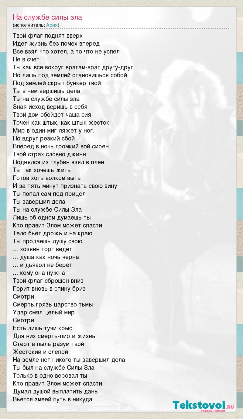 Твой флаг поднят вверх Идет жизнь без помех вперед Все взял что хотел, а то что не успел Не в счет Ты как все вокруг врагам-враг другу-друг Но лишь под землей становишься собой Под землей скрыт бункер твой Ты в нем вершишь дела Ты на службе силы зла Зная исход веришь в себя Твой дом обойдет чаша сия Точен как штык, как штык жесток Мир в один миг ляжет у ног. Но вдруг резкий сбой Вперед в ночь громкий вой сирен Твой страх словно джинн Поднялся из глубин взял в плен Ты так хочешь жить Готов хоть волком выть И за пять минут признать свою вину Ты попал сам под прицел Ты завершил дела Ты на службе Силы Зла Лишь об одном думаешь ты Кто правит Злом может спасти Тело бьет дрожь и на краю Ты продаешь душу свою ... хозяин торг ведет ... душа как ночь черна ... и дьявол не берет ... кому она нужна Твой флаг сброшен вниз Горит вновь в спину бриз Смотри Смерть,грязь царство тьмы Удар смял целый мир Смотри Есть лишь тучи крыс Для них смерть-пир и жизнь Стерт в пыль разум твой Жестокий и слепой На земле нет никого ты завершил дела Ты был на службе Силы Зла Только в одно веровал ты Кто правит Злом может спасти Думал душой выплатить дань Вьется змеей путь в никуда